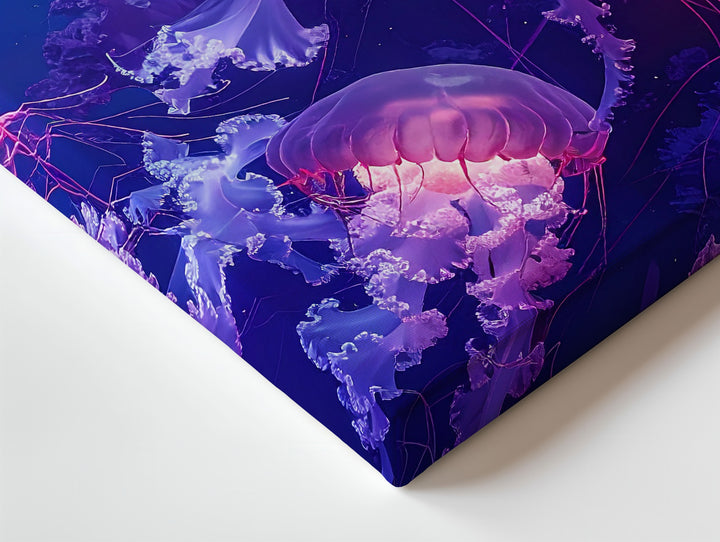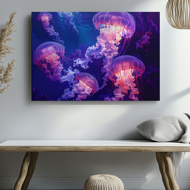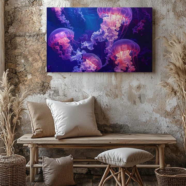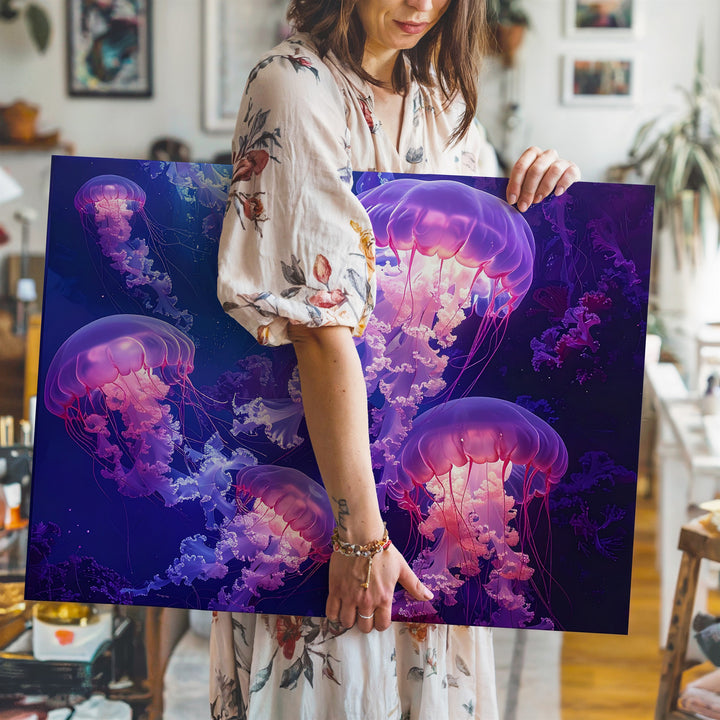 This vibrant canvas captures a dreamlike underwater scene where a group of jellyfish drift gracefully through deep blue and violet waters. Their translucent bodies glow with radiant pinks, purples, and whites, illuminating long, wispy tentacles as they pulse upward. Floating light particles add depth and serenity, while the dark gradient background enhances the ethereal bioluminescence—inviting wonder, tranquility, and the mystical beauty of the deep sea.