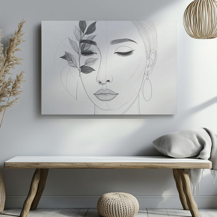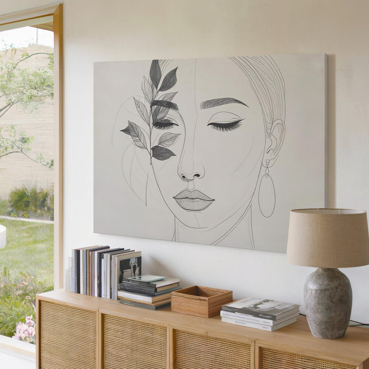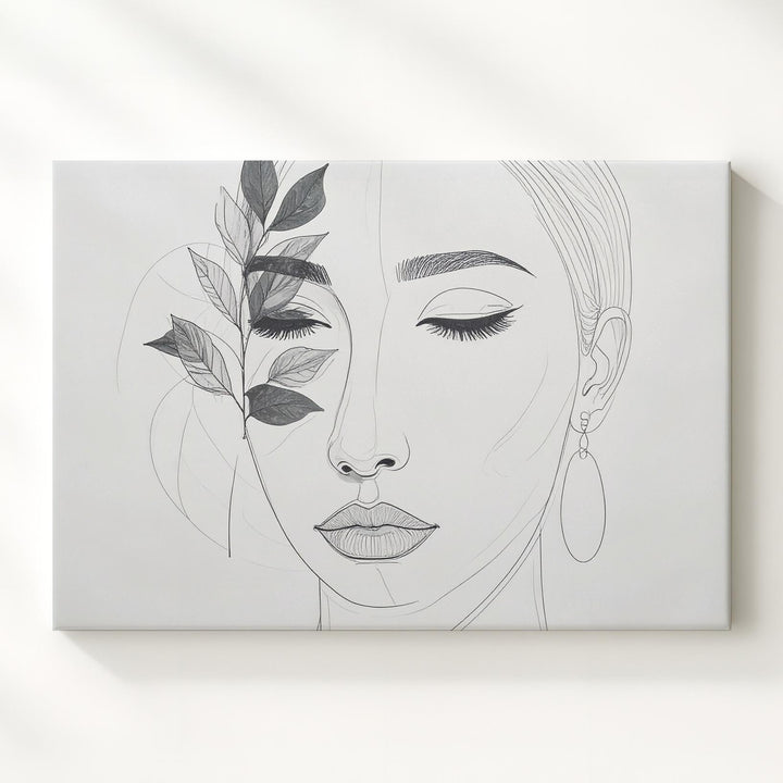 This elegant minimalist canvas features a continuous black line forming the serene face of a woman—her left eye gently closed, lips softly curved in calm. A delicate leaf branch drapes across her cheek, merging portraiture with nature in quiet harmony. A subtle earring on the right completes the balance. Set against a white background, this artwork whispers introspection, grace, and feminine strength.
