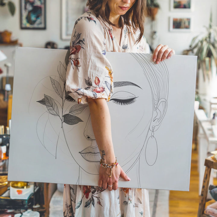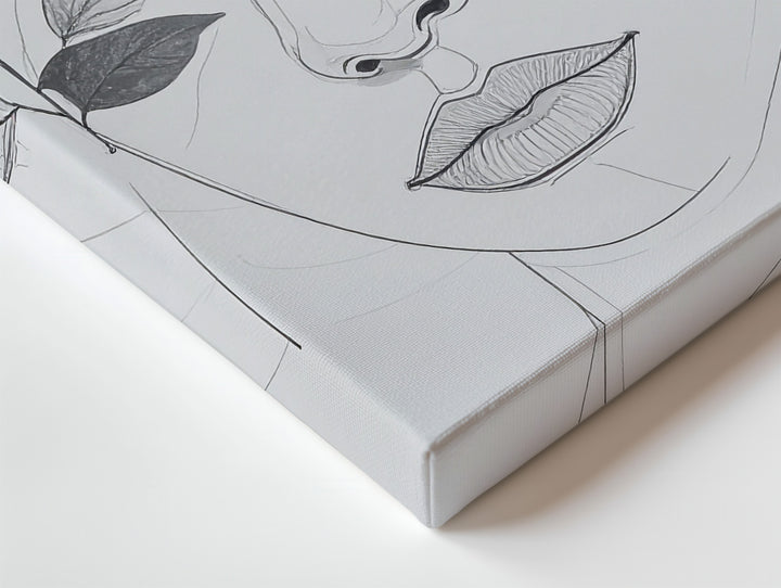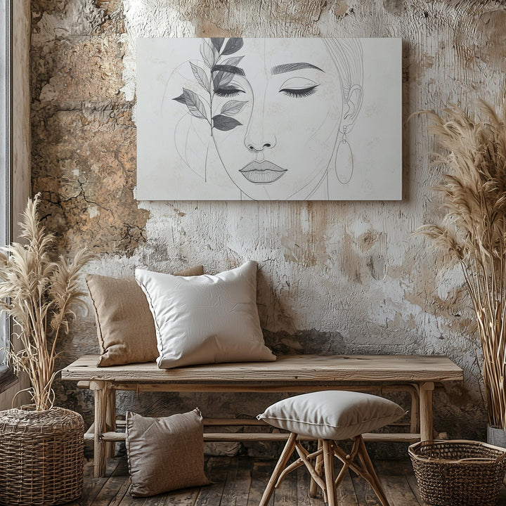 One-Line Feminine Portrait Canvas – Minimalist Face with Leaf Accent