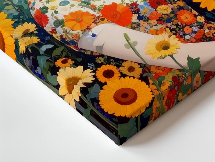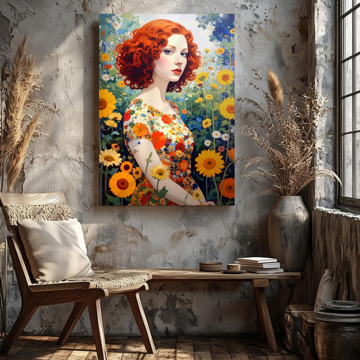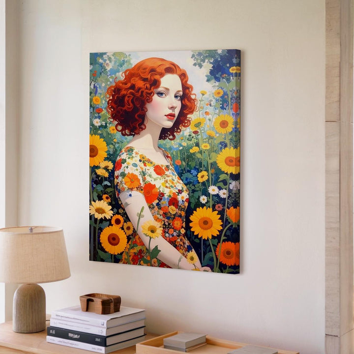 This stylized canvas captures a woman with curly red hair standing gracefully in a vibrant flower garden. Dressed in a floral-patterned dress that blends seamlessly with the surrounding field of sunflowers, daisies, and green stems, her introspective expression and gaze to the side evoke a sense of calm and quiet emotion. The intricate botanical details in the background, with a vivid color palette of yellows, greens, and oranges, create a striking contrast with her pale skin and red hair. This piece perfectly blends realism and decorative art, bringing nature’s beauty and emotional depth into your space.