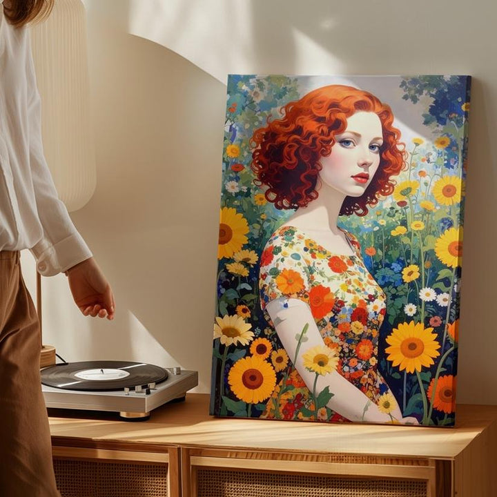 Floral Garden Portrait Canvas – Woman in Sunflower Field with Curly Red Hair