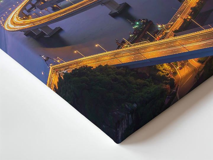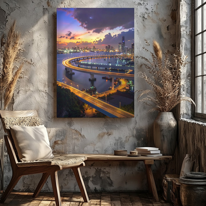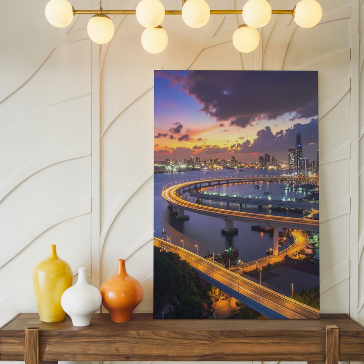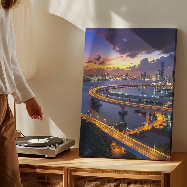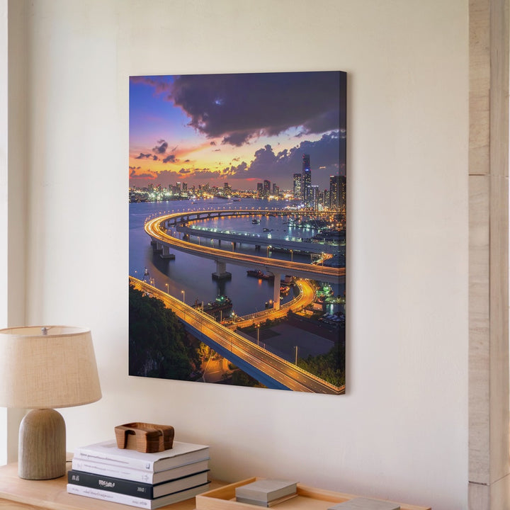 Futuristic Cityscape Canvas – Elevated Highway and Harbor at Dusk