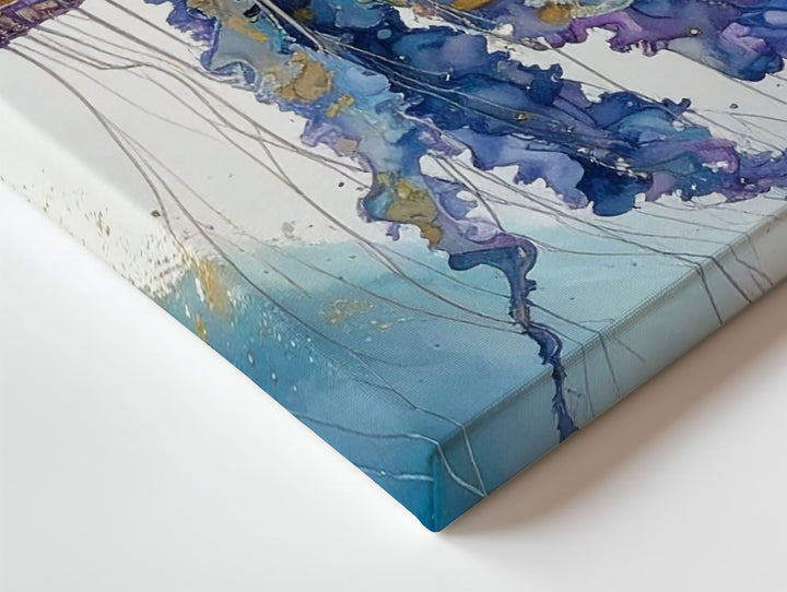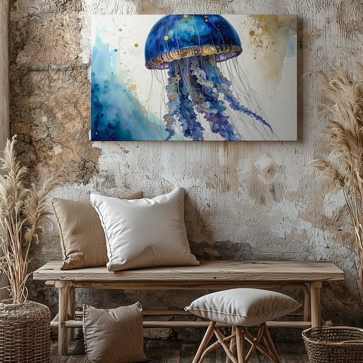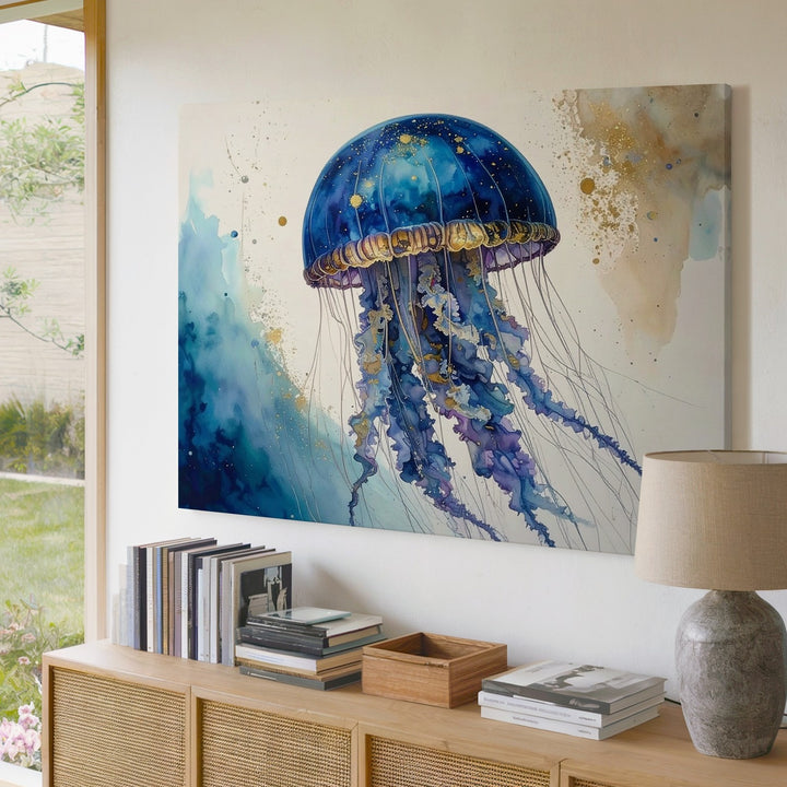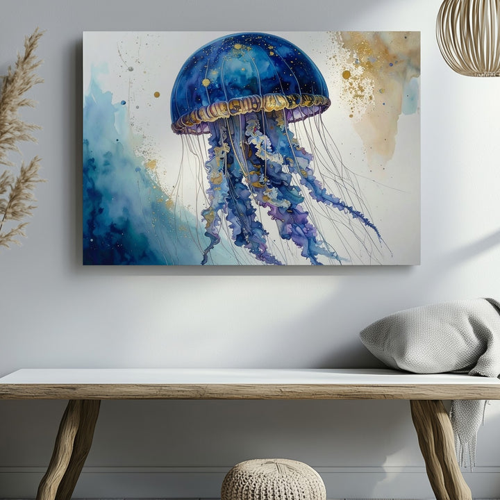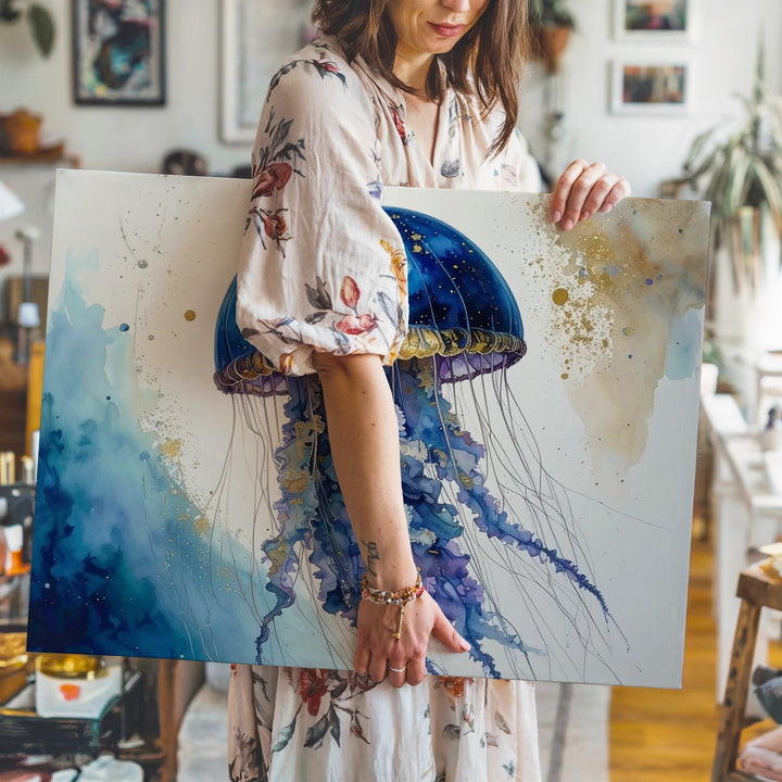 This exquisite watercolor canvas captures a stylized jellyfish floating against a pristine white background. Its dome-shaped bell glows with deep blues and purples accented by shimmering gold speckles, evoking the vastness of a galaxy. Flowing tentacles trail gracefully below, painted with dynamic splashes and ink-like drips that convey motion and spontaneity. Layered textures and translucent gradients create an ethereal sense of underwater suspension, blending natural realism with expressive artistry.