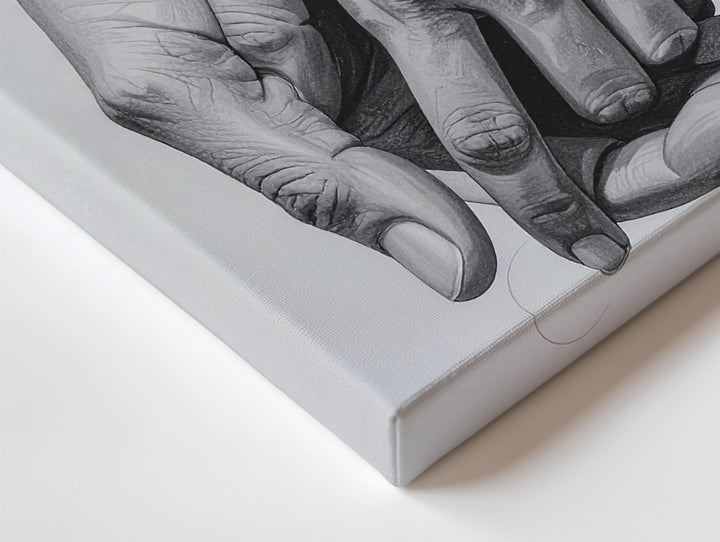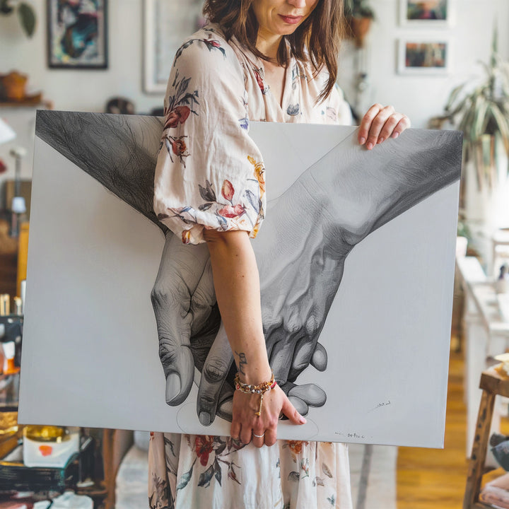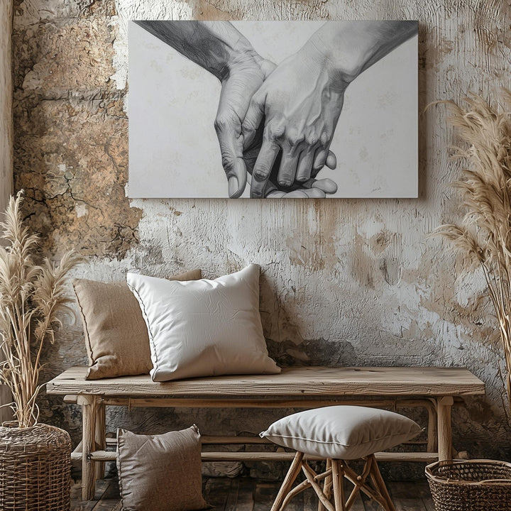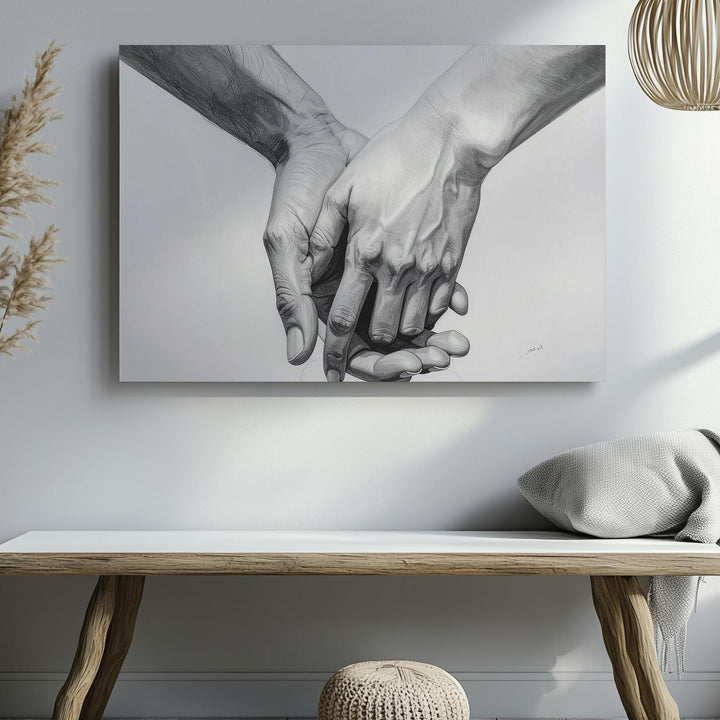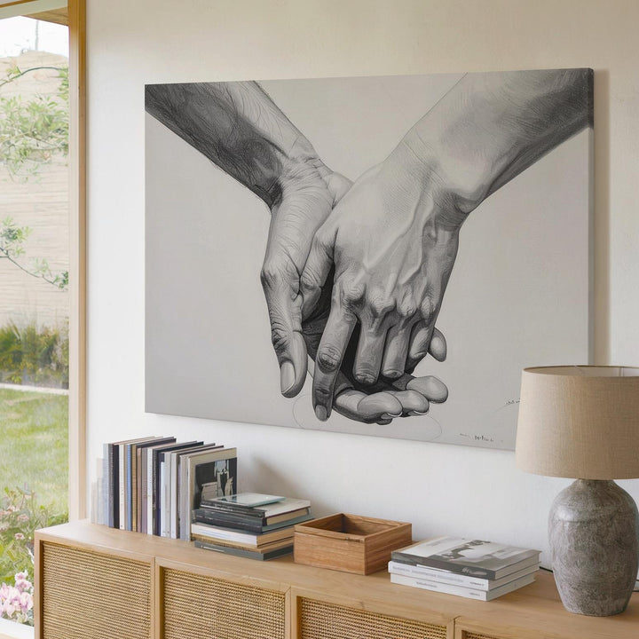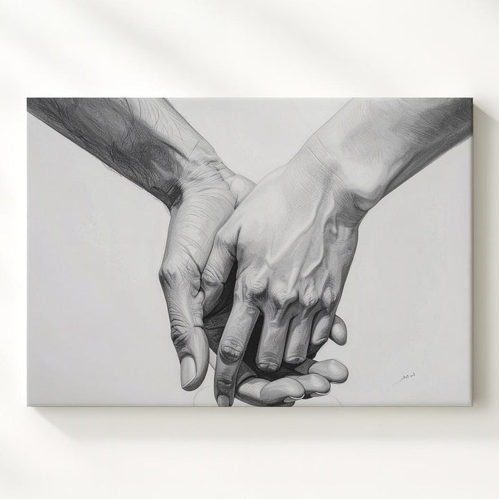 This minimalist canvas features two hands gently holding each other, beautifully rendered in detailed pencil or digital graphite. The shading captures the delicate nuances of the hands, while the stark white background ensures that the focus remains on the intimate connection between them. The relaxed yet secure grip symbolizes trust, support, and affection, with every line of the hands conveying deep emotional meaning. Simple yet profound, this piece speaks to the universal language of love and human connection.