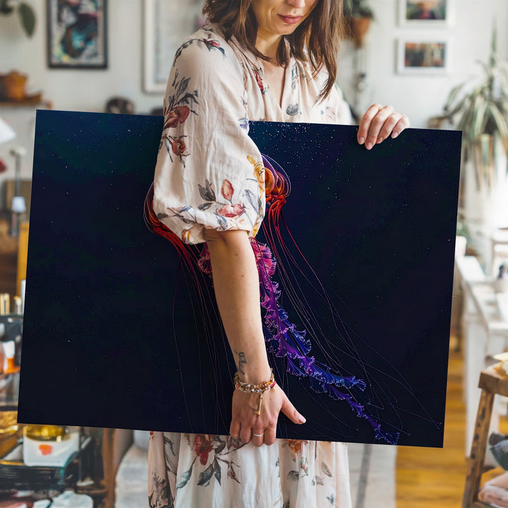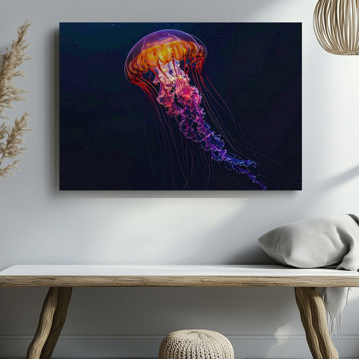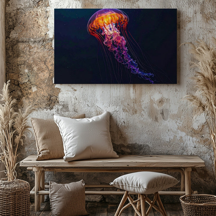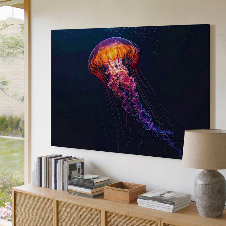 Embrace the quiet beauty of the deep ocean with this minimalist canvas artwork. A single jellyfish floats serenely in the darkness of the ocean void, its glowing bell radiating brilliant hues of orange and pink. Translucent tendrils trail delicately beneath, tinted in soft purples and reds, creating a glowing halo effect. The surrounding pitch-black expanse highlights the solitary elegance of this deep-sea creature, making it a striking focal point in any room. This moody, contemplative artwork is perfect for those seeking a peaceful yet impactful addition to their space.