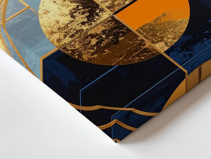 This bold digital abstract canvas merges geometric precision with dramatic flair. A radiant concentric gold circle anchors the composition, set against a layered backdrop of deep blue, black, and vibrant orange. Glossy reflections and subtle shadows suggest glass and light, while intersecting arcs and diagonal black stripes introduce movement and tension. With its architectural edge and glowing centerpiece, this artwork commands attention with sleek, modern sophistication.