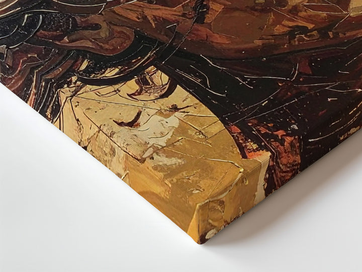 This stunning abstract canvas portrays a human face in swirling golden and copper tones. The texture, rich with layered strokes, creates a deeply emotional portrait—both ancient and futuristic. The face seems both present and absent, with eyes obscured and features deconstructed. The gold, bronze, and ochre palette brings a sense of warmth and contemplation, making it a perfect addition for spaces that invite introspection and artistic beauty.