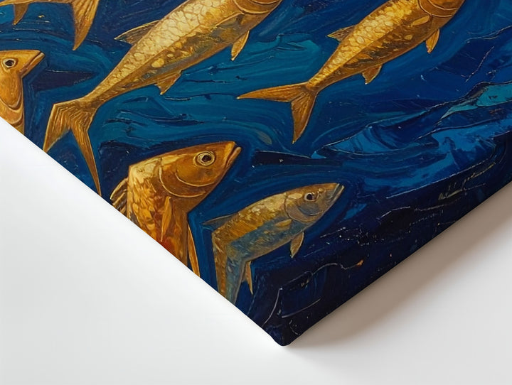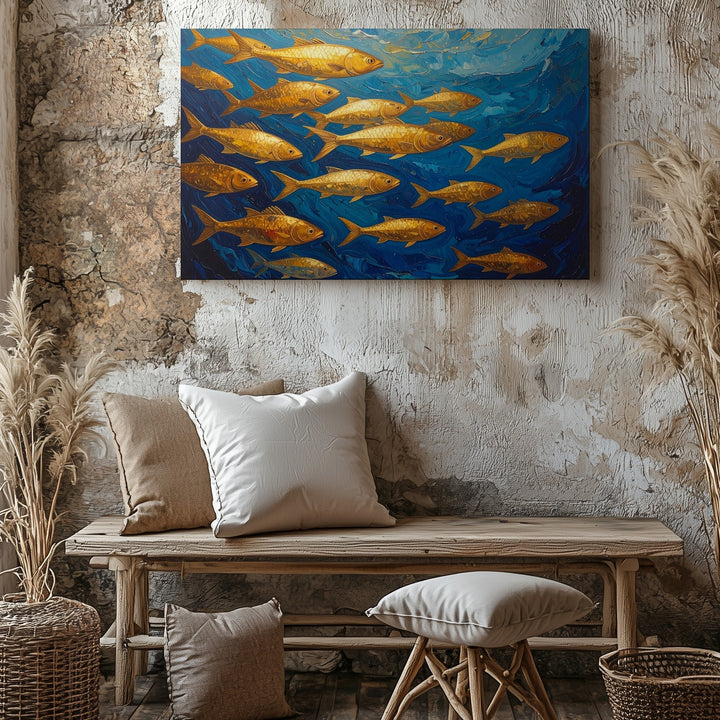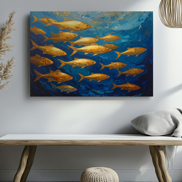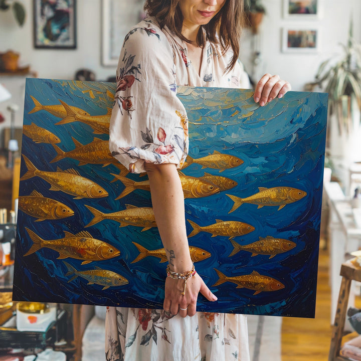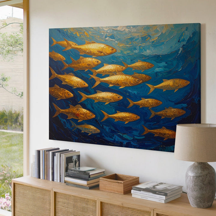 Bring the energy and elegance of the ocean into your space with this striking canvas art. A school of golden fish swims gracefully through deep blue waters, their metallic tones shimmering against the dark blues and aquamarine sea. The uniform pattern of the fish, all facing the same direction, creates a dynamic rhythm, while the textured brushstrokes convey movement in both the fish and the surrounding water. This modern abstract piece merges natural beauty with artistic sophistication, perfect for those who appreciate contemporary design and the peaceful rhythm of the sea.