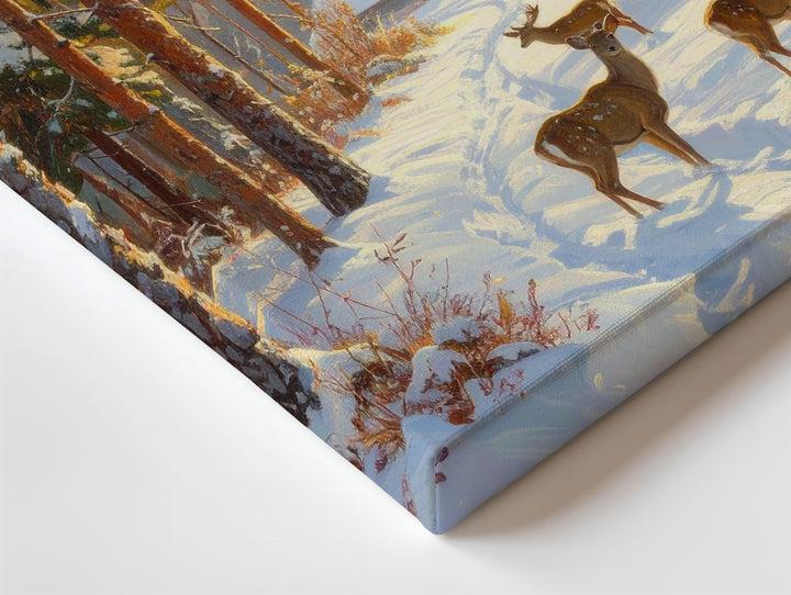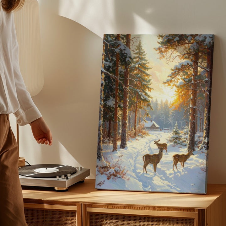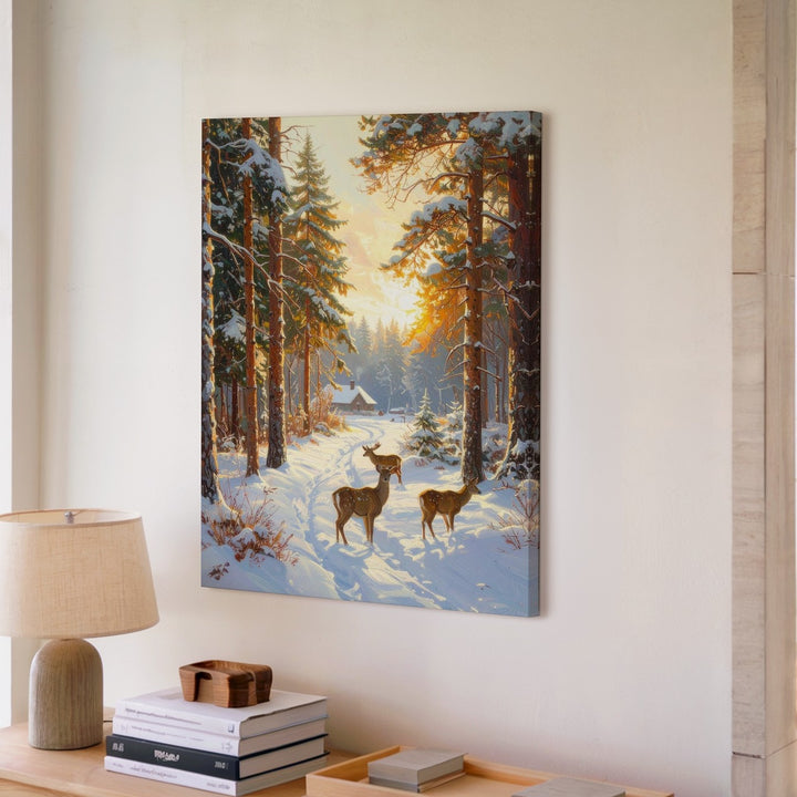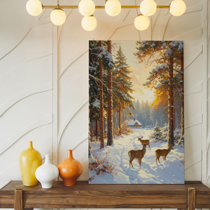 Golden Forest Winter Canvas – Deer, Cabin & Snowy Pine Path Scene