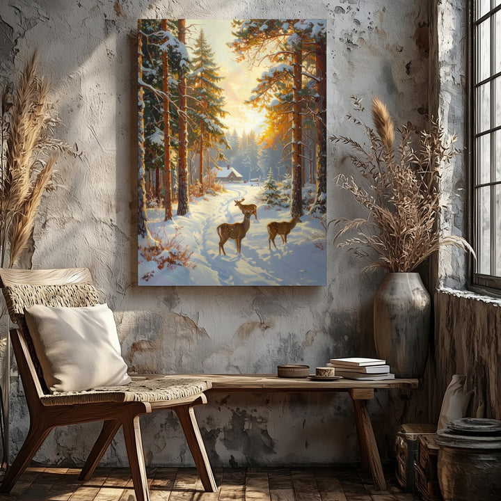 This breathtaking winter canvas captures a golden sunrise spilling through snow-dusted pines, illuminating a quiet path that winds toward a distant wooden cabin. In the foreground, two deer stand gracefully in the snow—one alert, the other at ease—bringing life and presence to the serene wilderness. The scene blends rich textures of bark, fur, and snow with warm golden tones and cool winter blues, evoking a feeling of calm, wild beauty, and sacred stillness.