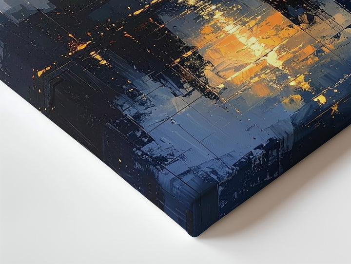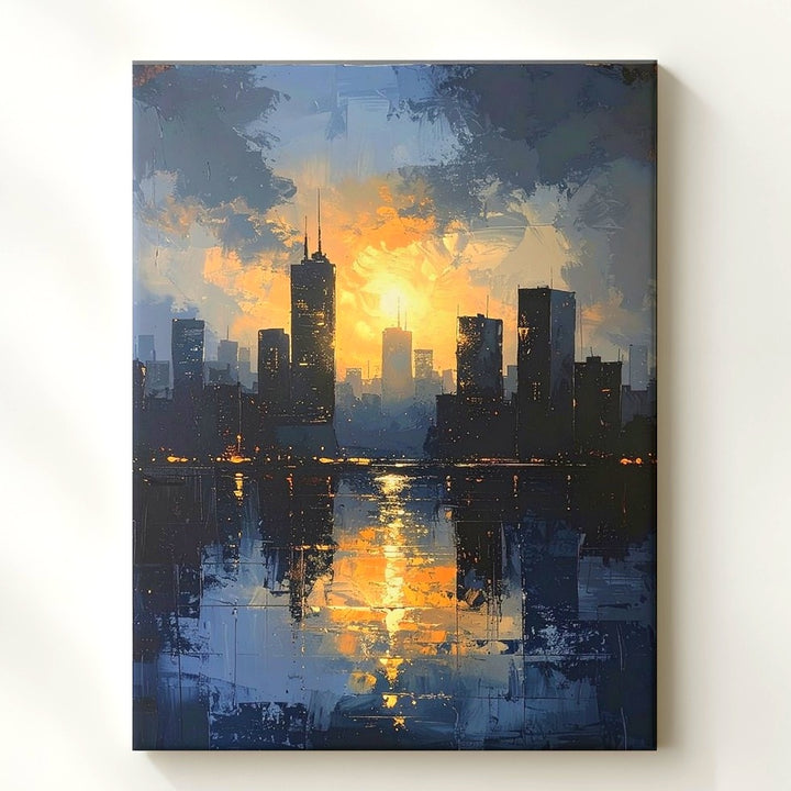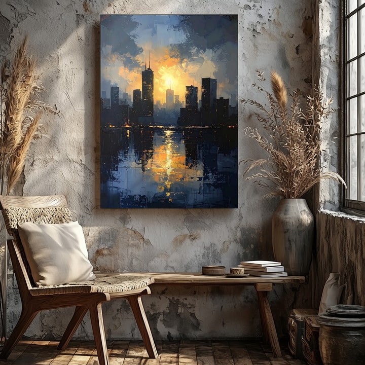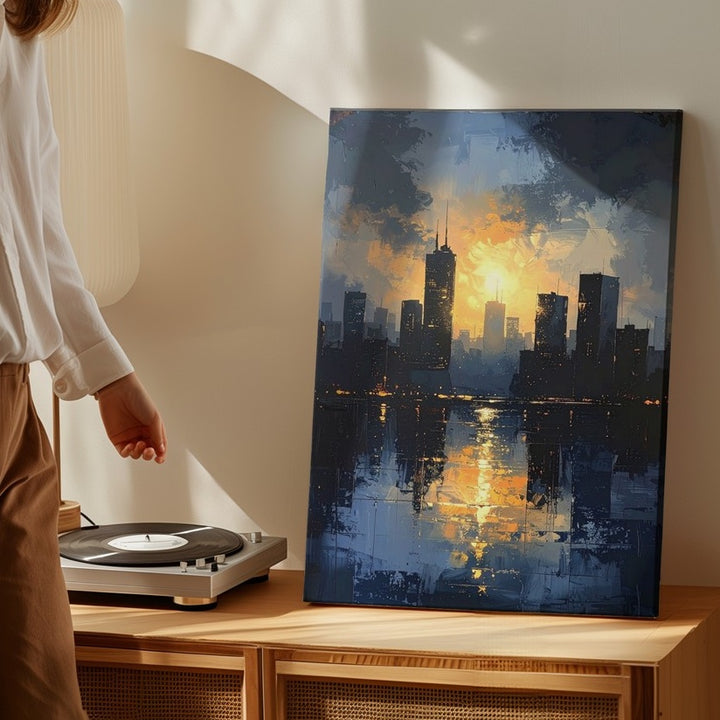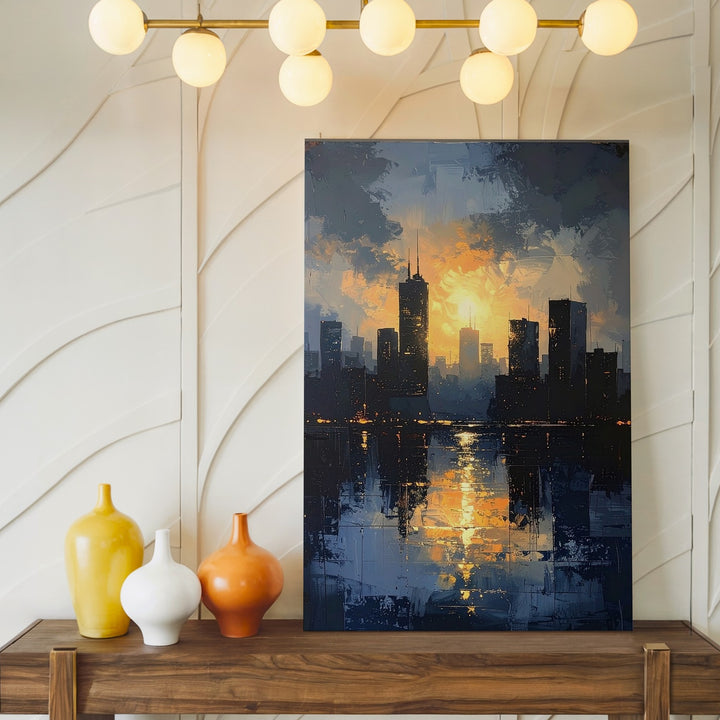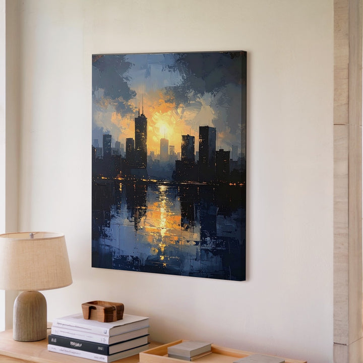 Golden Glow Skyline Canvas – Moody Futuristic Cityscape at Dusk