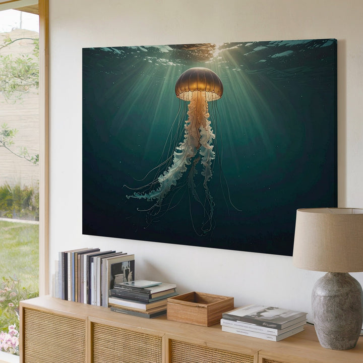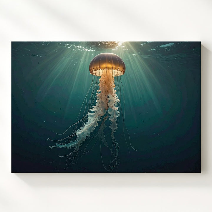 Golden Drift Jellyfish Canvas – Solitary Glow in Ocean Depth