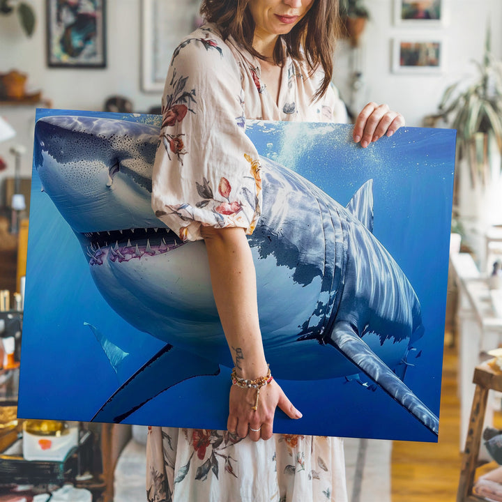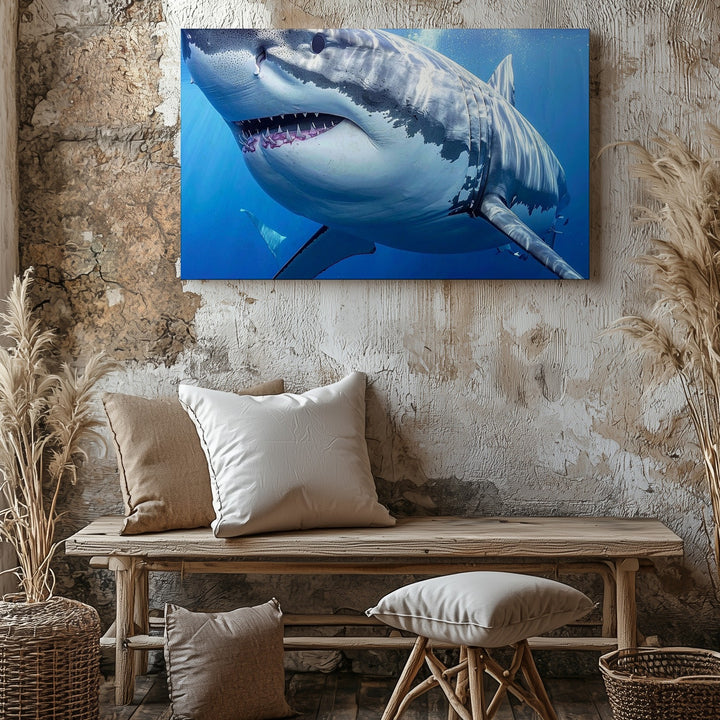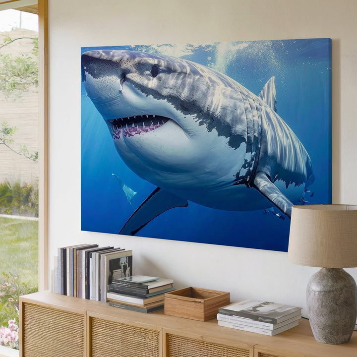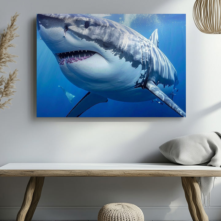 Head-On Great White Shark Canvas – Underwater Predator Portrait