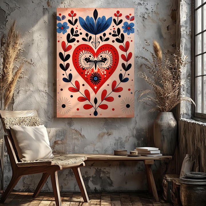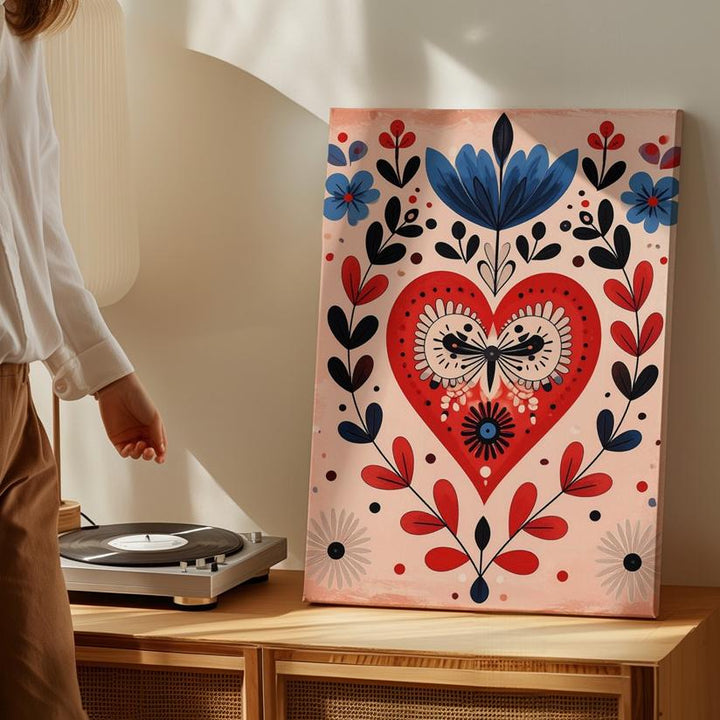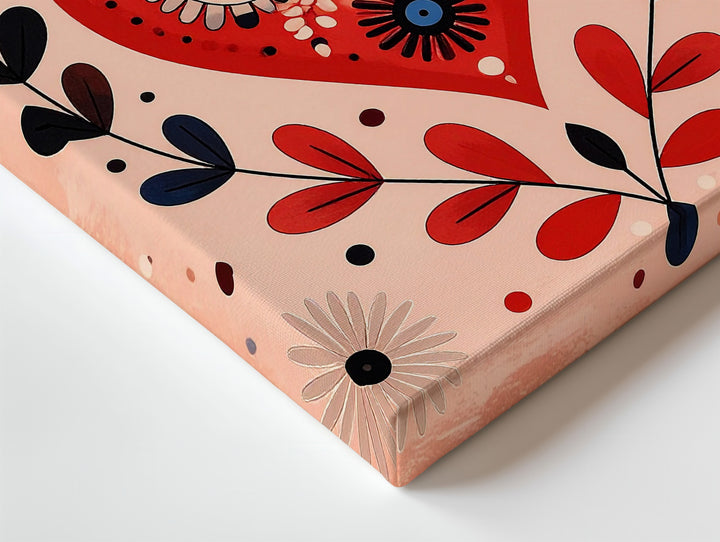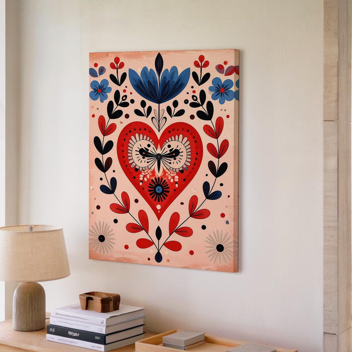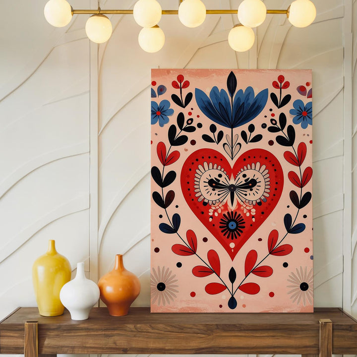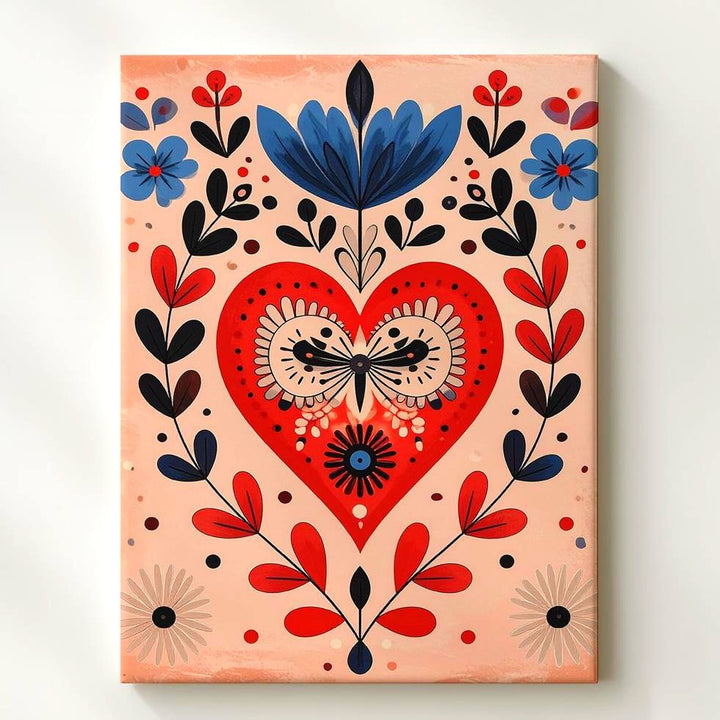 This stunning folk-art canvas features a symmetrical red heart, adorned with delicate black leaves, tulip motifs, and small floral patterns. The heart is framed by vibrant blue, red, and black flowers, set against a soft peach background that gives the piece warmth and charm. The clean lines and bold contrast create a handcrafted, traditional feel, while the symmetry and balance evoke a sense of harmony and celebration of love.