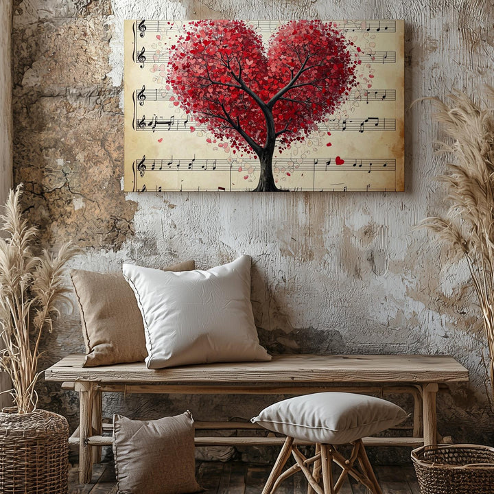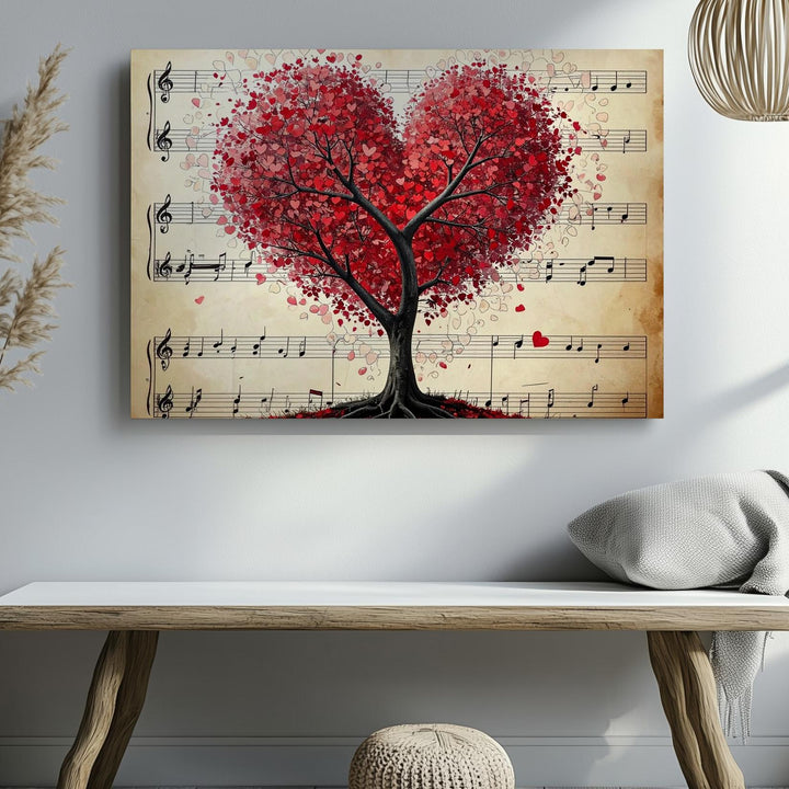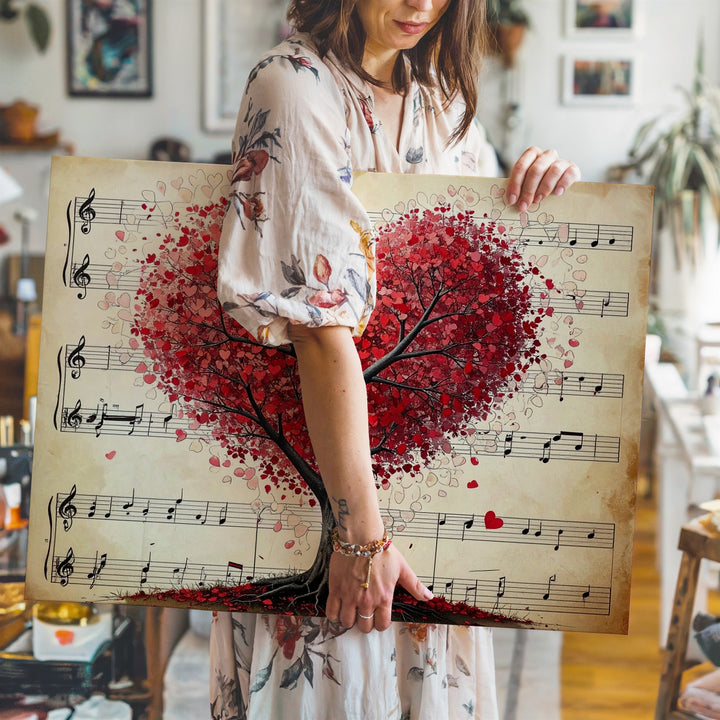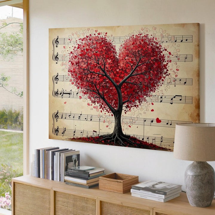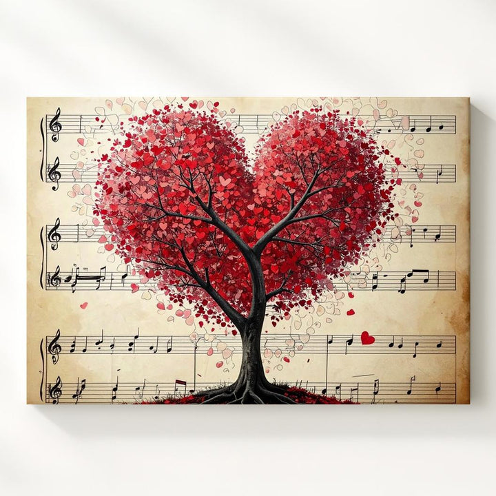 This evocative canvas blends nature and music into a single poetic image: a heart-shaped tree made of vibrant red leaves rooted in black, standing tall against a softly textured background of faded sheet music. Scattered leaves drift gently from the heart, as if emotions are falling into song. The contrast of bold red with antique beige tones brings depth, romance, and harmony into any space.