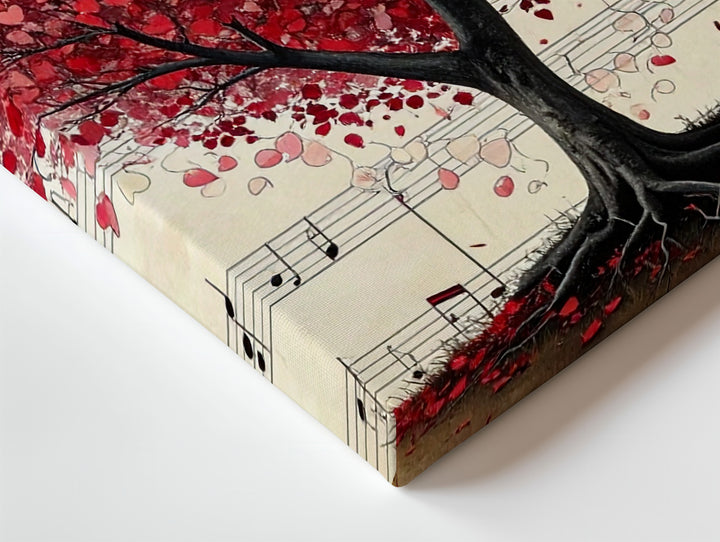 Heart Tree with Music Canvas – Romantic Red Foliage on Vintage Sheet Background