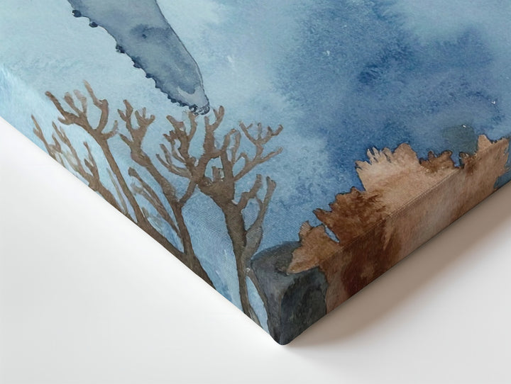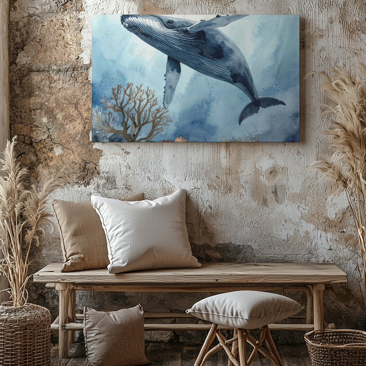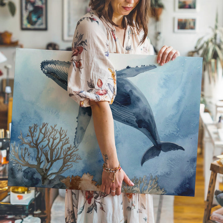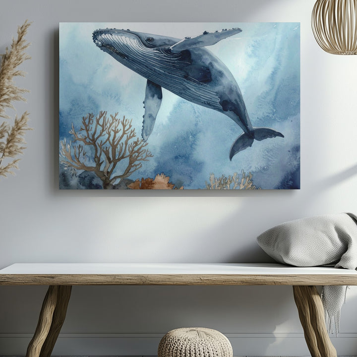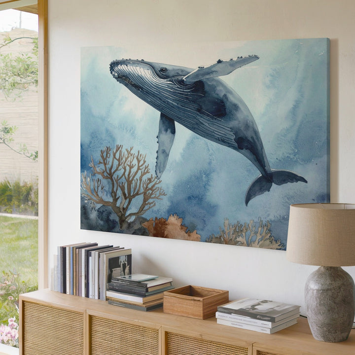This textured watercolor canvas portrays a majestic humpback whale swimming downward through a moody seascape. Its dark blue-gray skin and detailed fins contrast softly against muted coral silhouettes rising from the seabed below. A subtle gradient from light to dark creates depth and dreamlike atmosphere, blending abstract textures with realistic form. This serene, poetic piece captures the quiet grandeur and mystery of ocean life in elegant watercolor style.