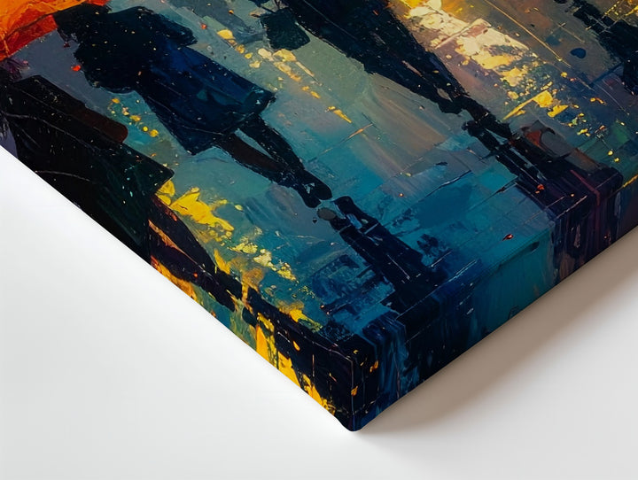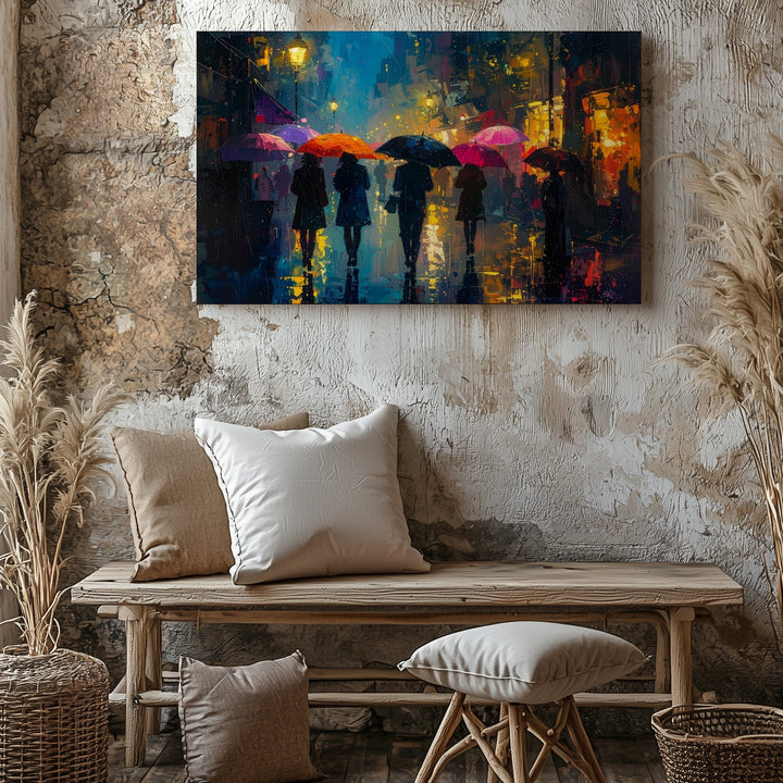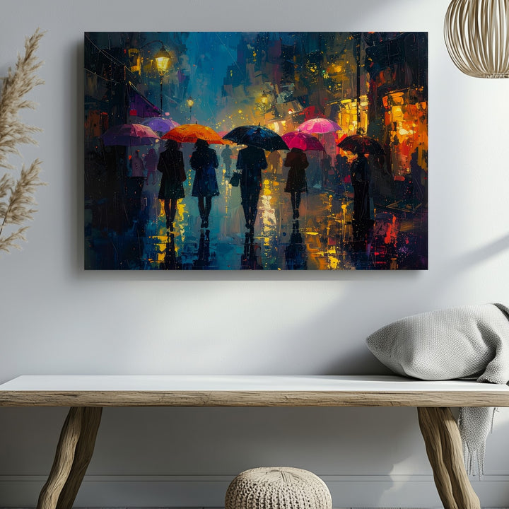 Rainy Night Stroll Canvas – Impressionistic Umbrella Walk with Vibrant Lights