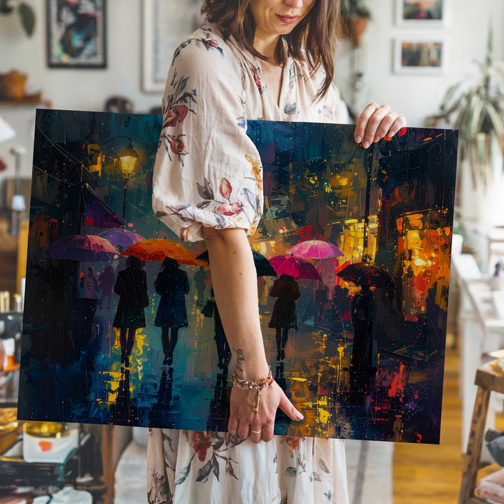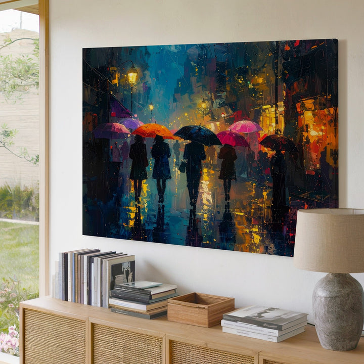 This impressionist canvas captures the poetry of a rainy city evening where silhouetted figures move beneath umbrellas bursting with reds, oranges, pinks, and purples. Wet streets mirror golden streetlights and shop windows, blending loose brushstrokes with layered texture to evoke movement, romance, and quiet contemplation. It’s a celebration of urban life’s tender moments beneath the rain’s gentle glow.