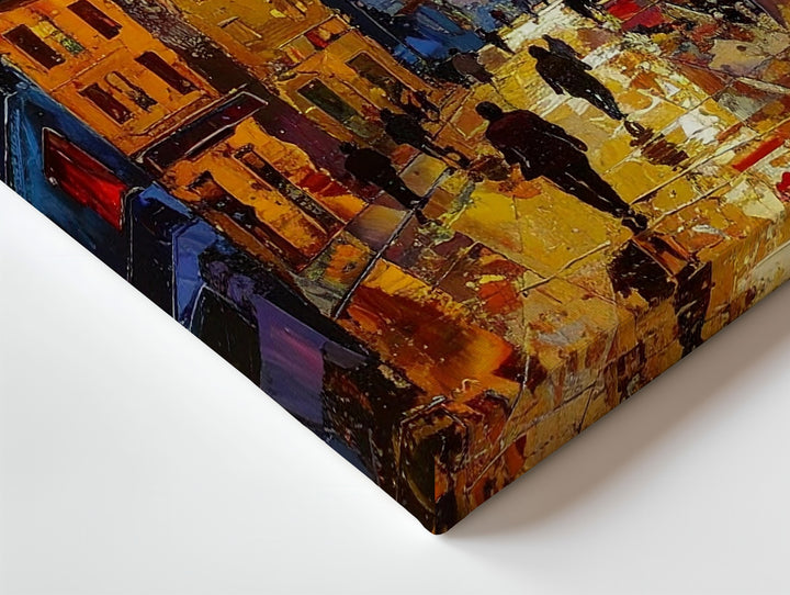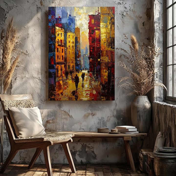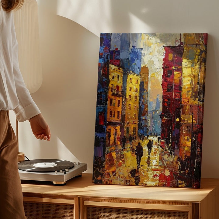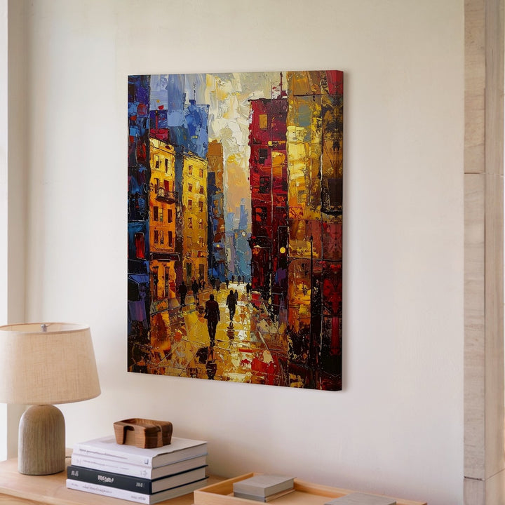This textured, impressionistic canvas captures the energy of an evening or night in the city, with towering buildings aglow in rich layers of yellows, reds, blues, and oranges. The impasto painting style emphasizes the movement of light and texture, making the cityscape come alive. People walk below in shadow, their abstract forms blending seamlessly into the golden reflections on the wet ground. The brushstrokes are bold and expressive, giving the scene an energetic, immersive feel that captures the vibrancy of a bustling urban environment. Perfect for those who love art that transforms everyday moments into glowing, dynamic experiences.
