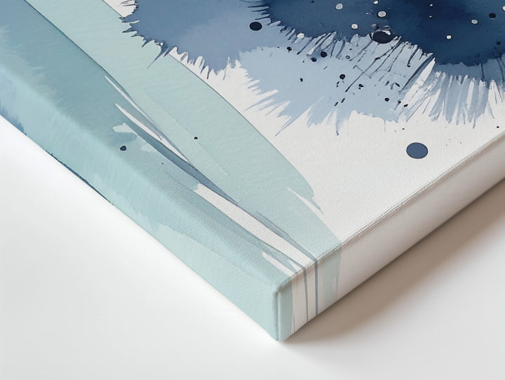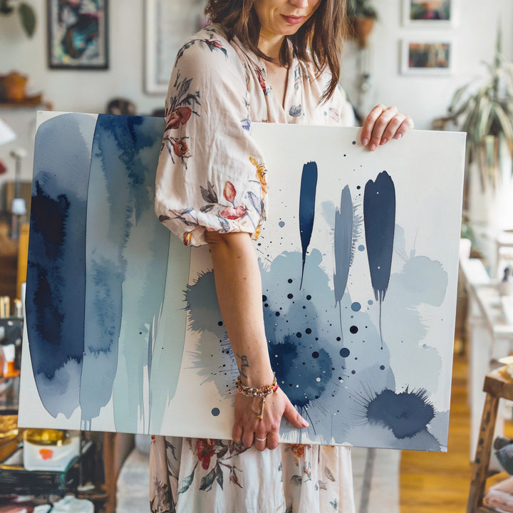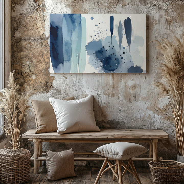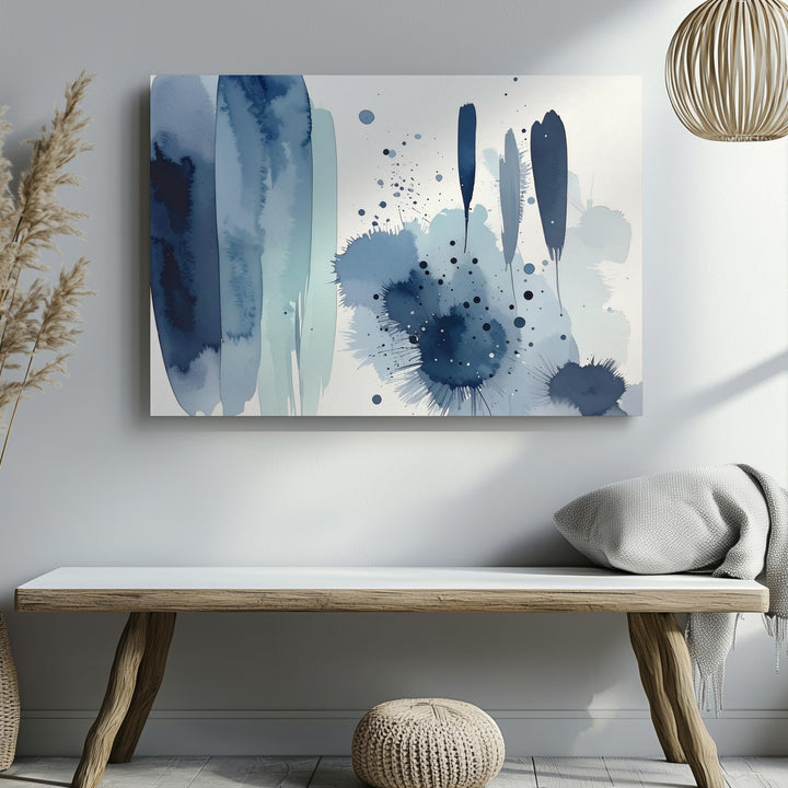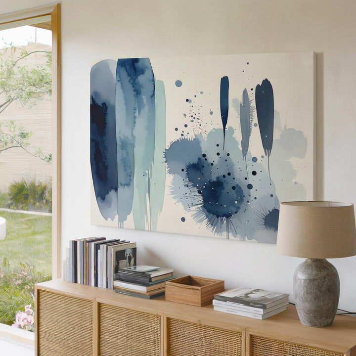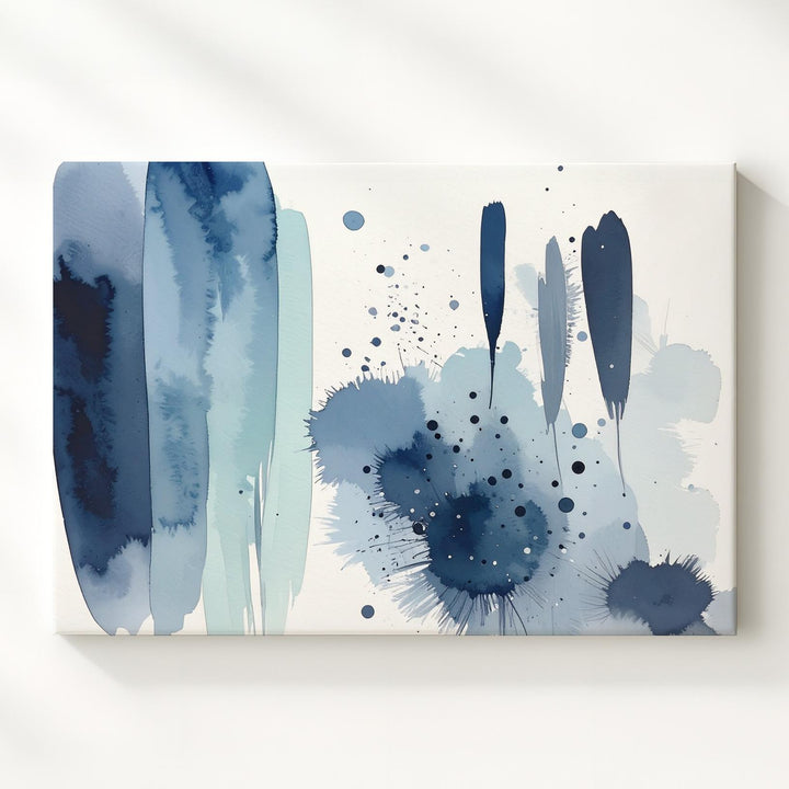 This minimalist watercolor canvas features cool indigo and teal forms that softly blend and contrast against pristine white space. Wisps of navy brush marks and spontaneous splatters bring energy and motion, while the thoughtful asymmetry invites calm contemplation. A modern expression of fluidity and subtle depth, it enriches any minimalist or contemporary setting.