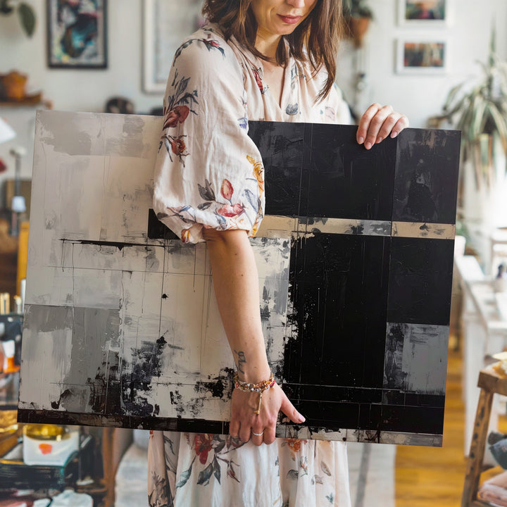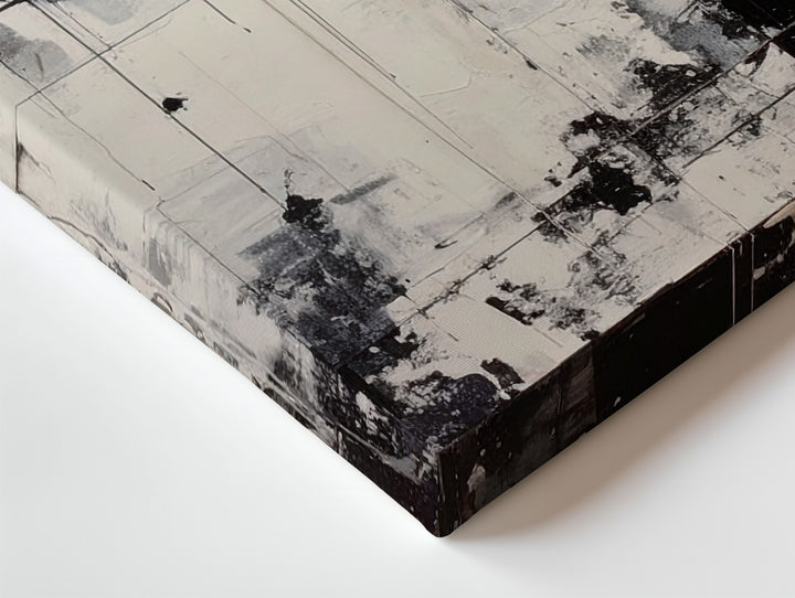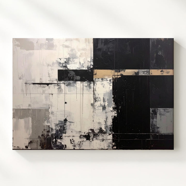 This minimalist abstract canvas showcases a striking contrast between a textured off-white background and a bold black vertical block on the right. A subtle beige strip intersects near the center, forming a cross-like shape. The weathered white background, with its streaks, smudges, and layered textures, speaks of time and imperfection. The solid black section, with its subtle gradients and rough edges, adds a raw, industrial feel to the composition. The intersection of elements creates a quiet balance in an otherwise asymmetric design, making this piece perfect for contemplative, modern spaces.