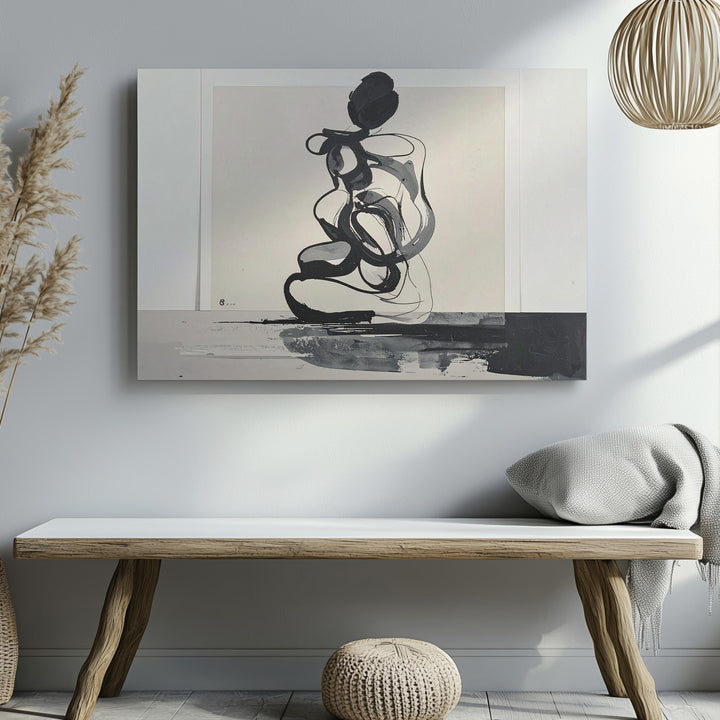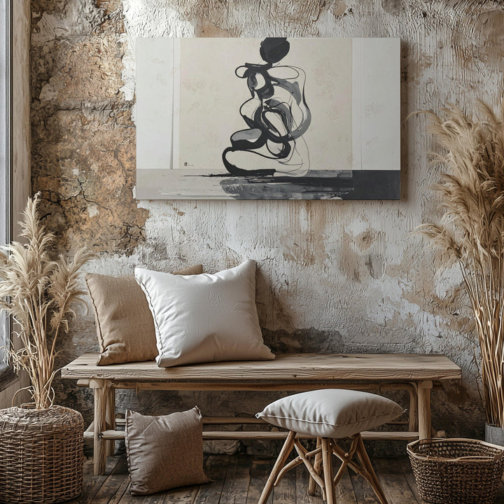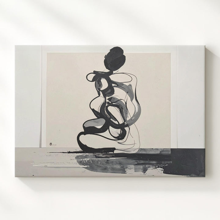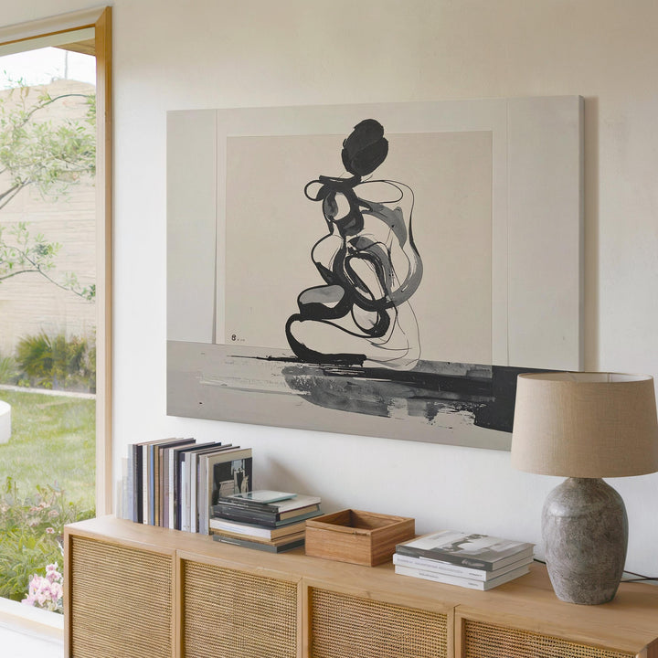 This minimalist ink drawing features a thick, fluid black line forming an abstract, intertwined shape against a soft beige background. Suggesting the outline of a seated figure, the smooth, rounded curves create an expressive form that balances simplicity with depth. Set within a subtle off-white border resembling handmade paper, this piece channels modern minimalism with raw emotion and graphic clarity—perfect for contemporary spaces craving impactful yet understated art.