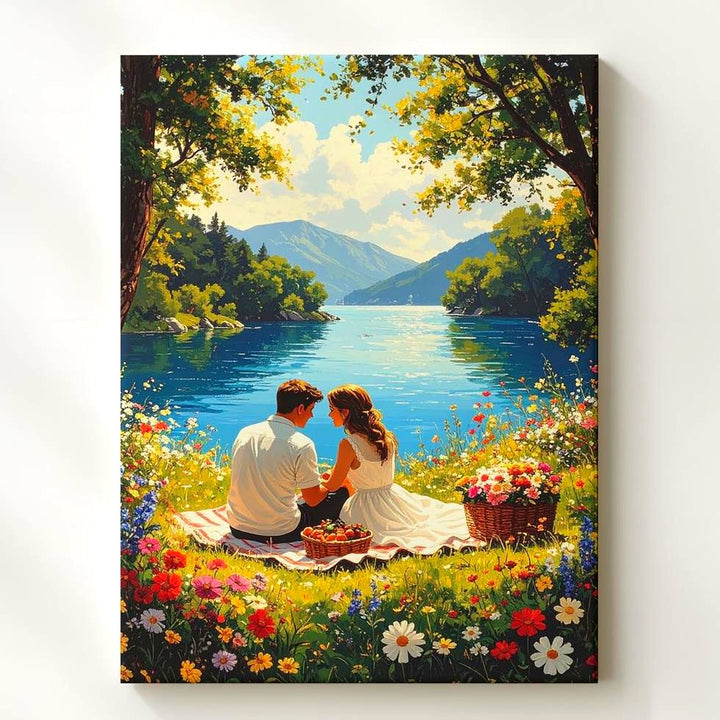 This peaceful canvas captures the beauty of a lakeside picnic, where a young couple sits closely together on a grassy hill, surrounded by vibrant flowers and lush green trees. The serene blue lake reflects the clear sky and the surrounding nature, while the soft sunlight filters through the leaves, casting a warm glow over the scene. This tranquil setting evokes a sense of calm, highlighting the beauty of love and connection in nature’s peaceful surroundings.