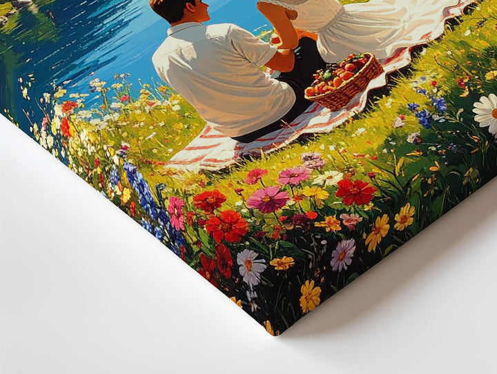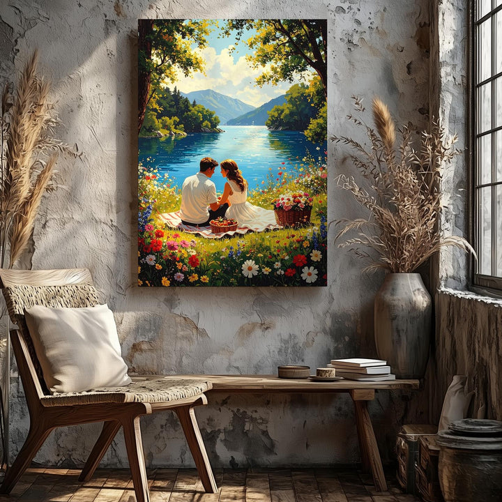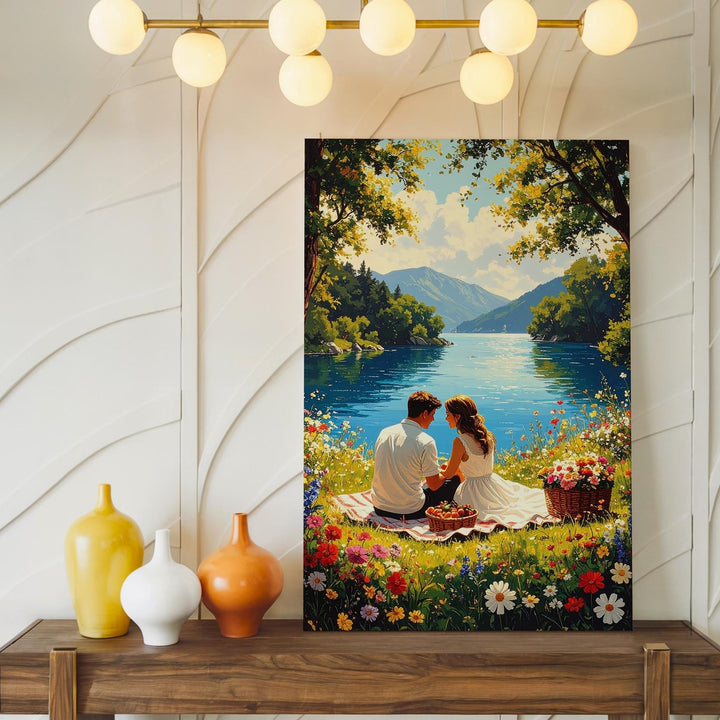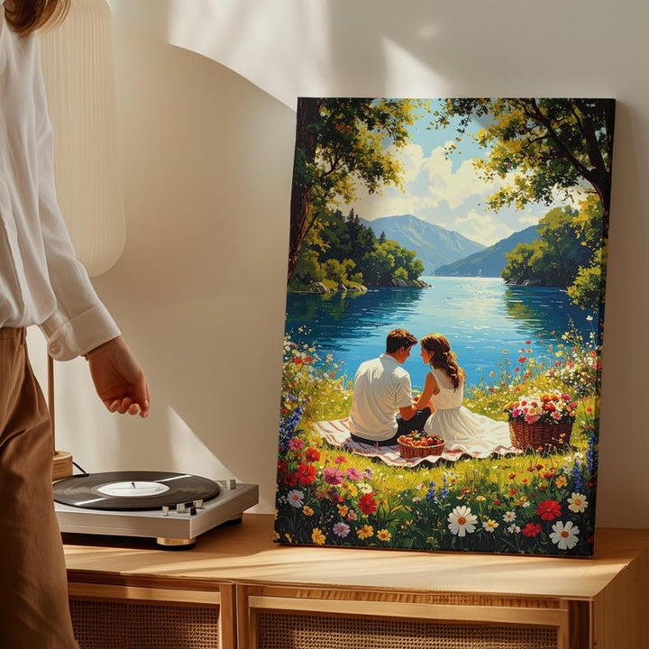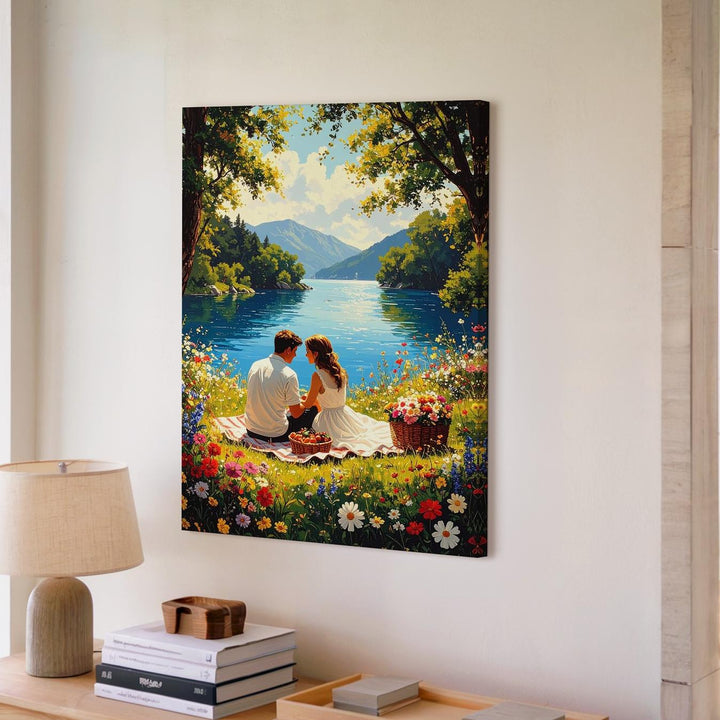 Lakeside Picnic Love Canvas – Serene Couple Moment by the Water