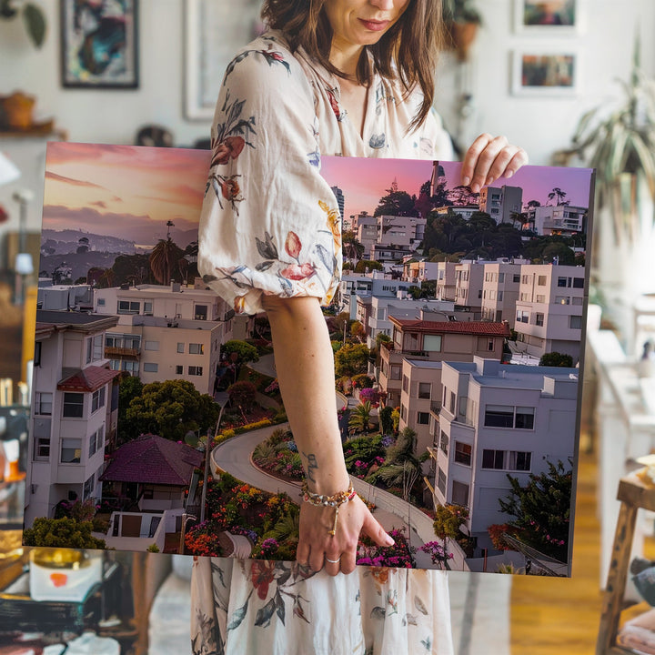 This vivid canvas captures the iconic curves of San Francisco’s Lombard Street from above—serpentine and surreal against a backdrop of soft pink skies and golden twilight. Framed by quiet gray rooftops, the lush green hedges and bright flowers lining the street create a ribbon of color winding through the city's grid. Empty of traffic, full of grace, this aerial view is a celebration of architectural rhythm and natural beauty intertwined.