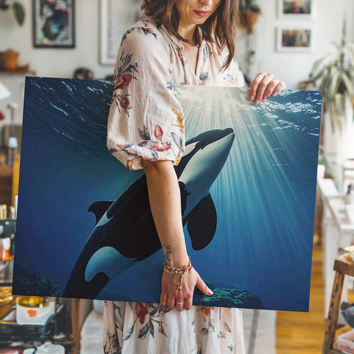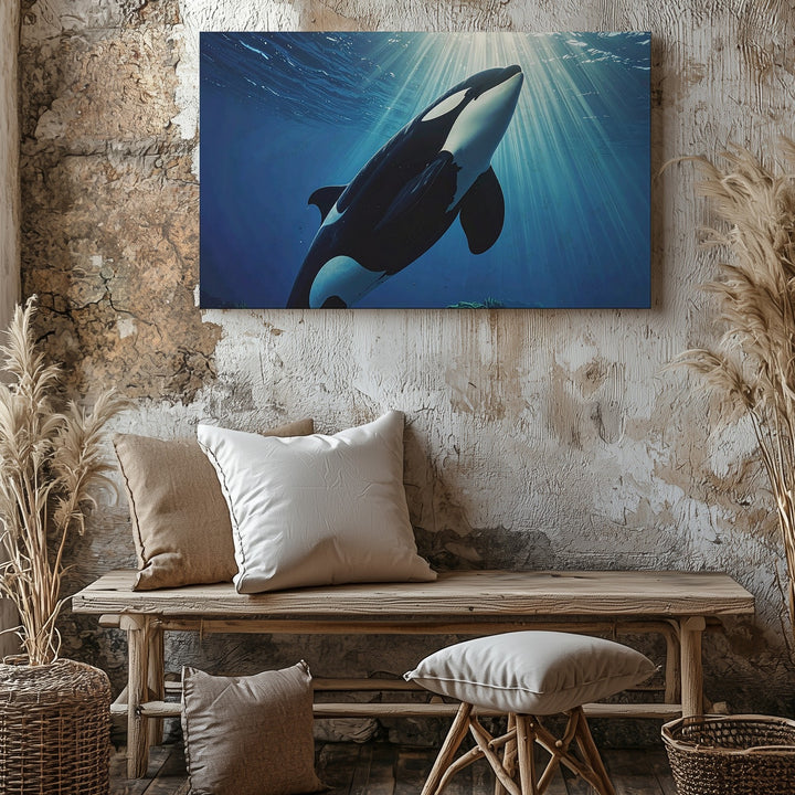 This breathtaking canvas captures a moment of serene majesty as an orca ascends gracefully toward rays of sunlight streaming through deep blue waters. The dramatic illumination highlights the whale’s sleek black and white form, blending photorealism and cinematic composition to create an awe-inspiring depiction of oceanic freedom and quiet strength.