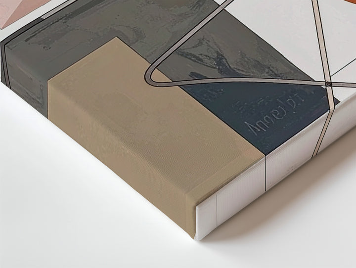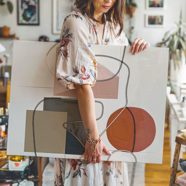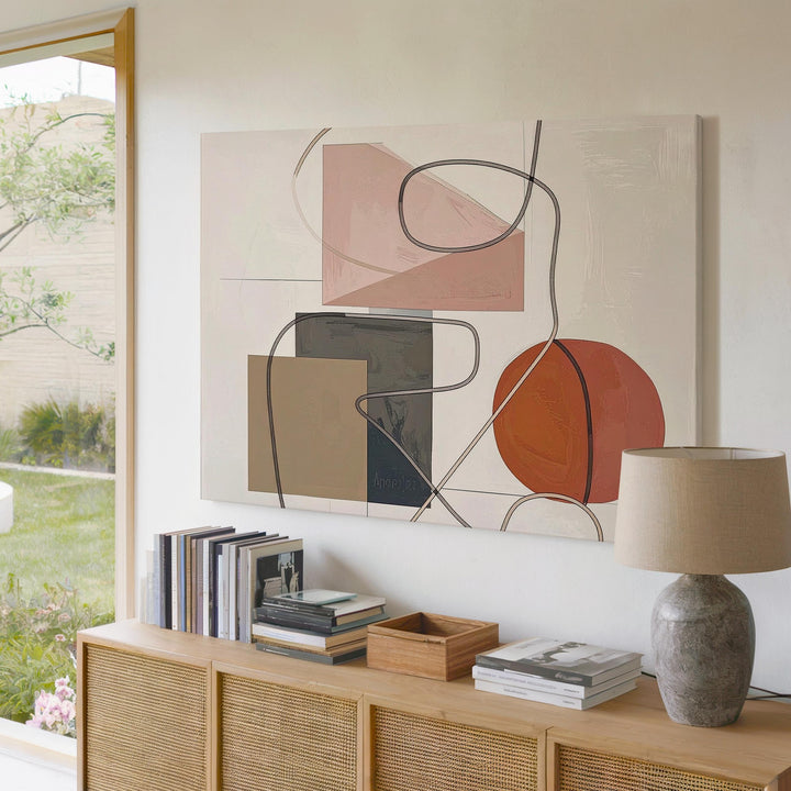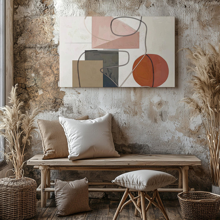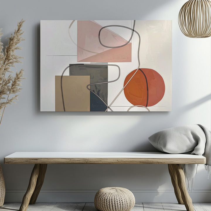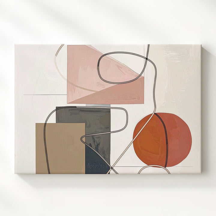 This contemporary canvas blends soft geometric forms with a fluid, unbroken black line that dances across the composition. A muted brown rectangle, a red-orange circle, and a dusty pink shape offer contrast and grounding on a crisp white background. Together, they form a mid-century-inspired harmony—where movement, form, and quiet design come alive.