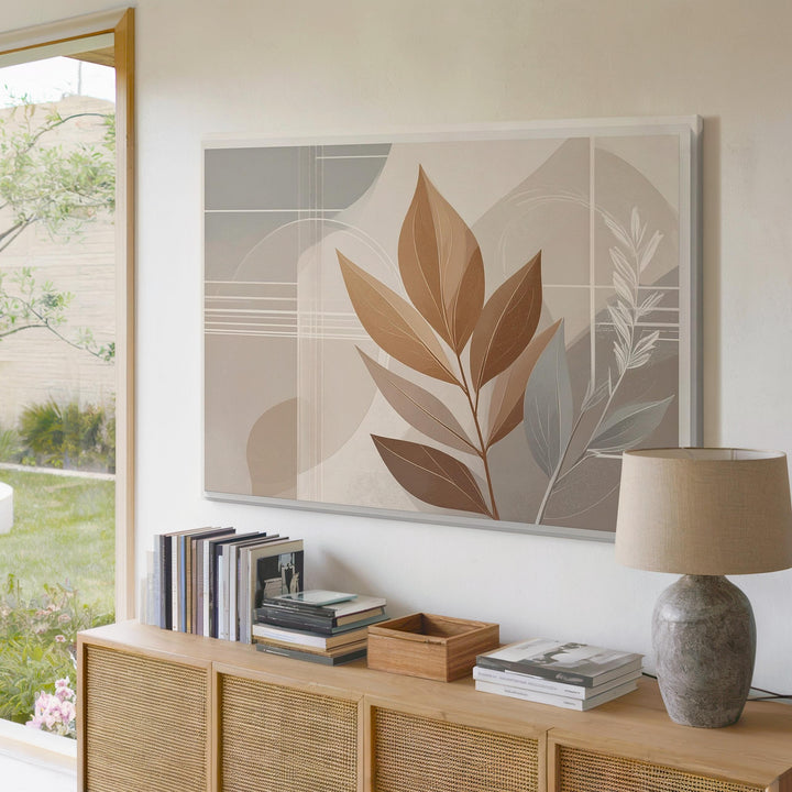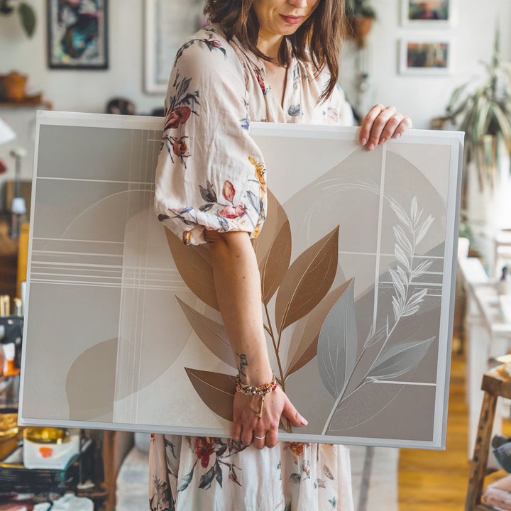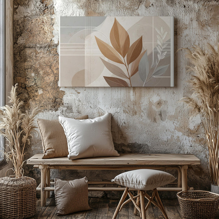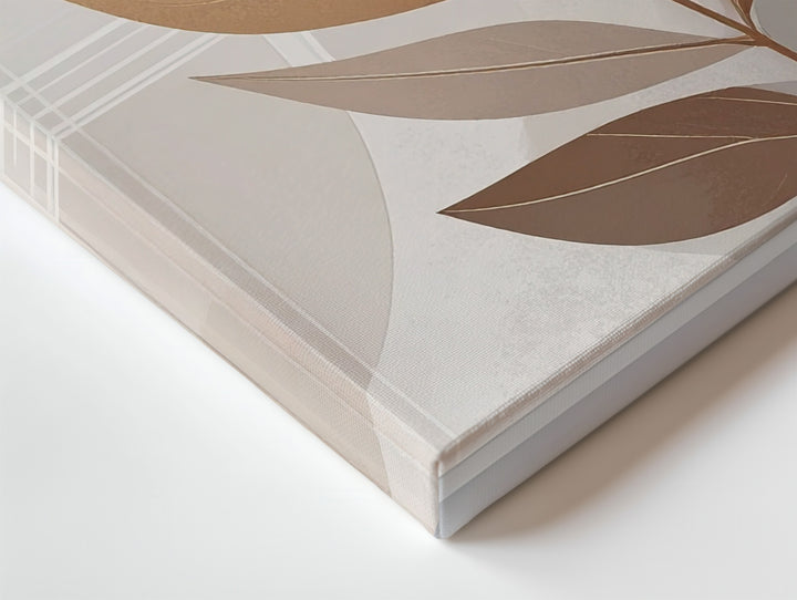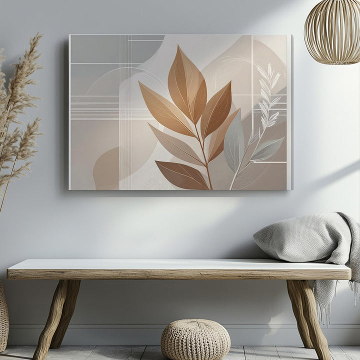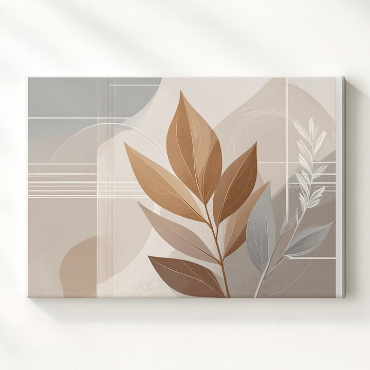 This abstract botanical canvas features a stylized brown leaf elegantly centered against layers of soft beige and taupe rectangles. The subtle interplay of organic shapes and delicate geometric lines creates a serene balance, offering warmth, simplicity, and refined sophistication to any modern interior.