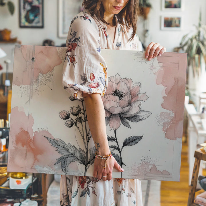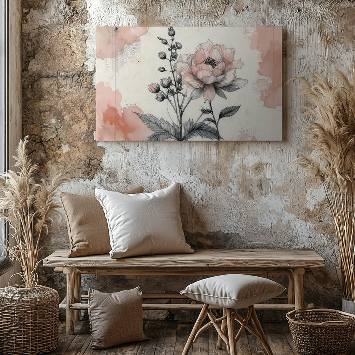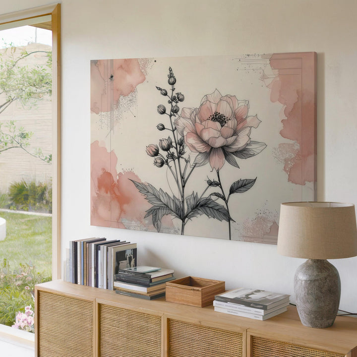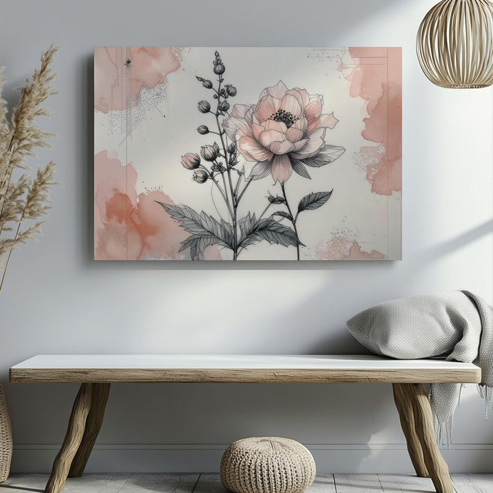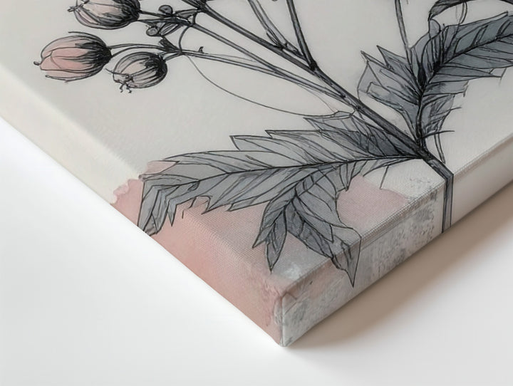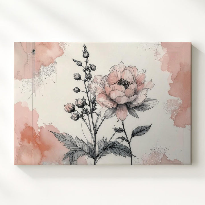 This serene floral canvas features a finely drawn vertical stem with delicate blossoms and rounded buds, framed by gentle blush pink watercolor textures in the corners. With added white space and light stippling, the design breathes with calm and clarity. The minimalist approach highlights nature’s quiet grace—making it a soothing addition to any space seeking elegance in restraint.