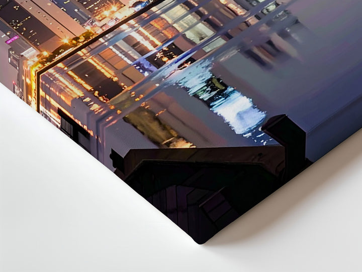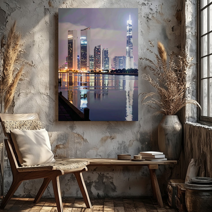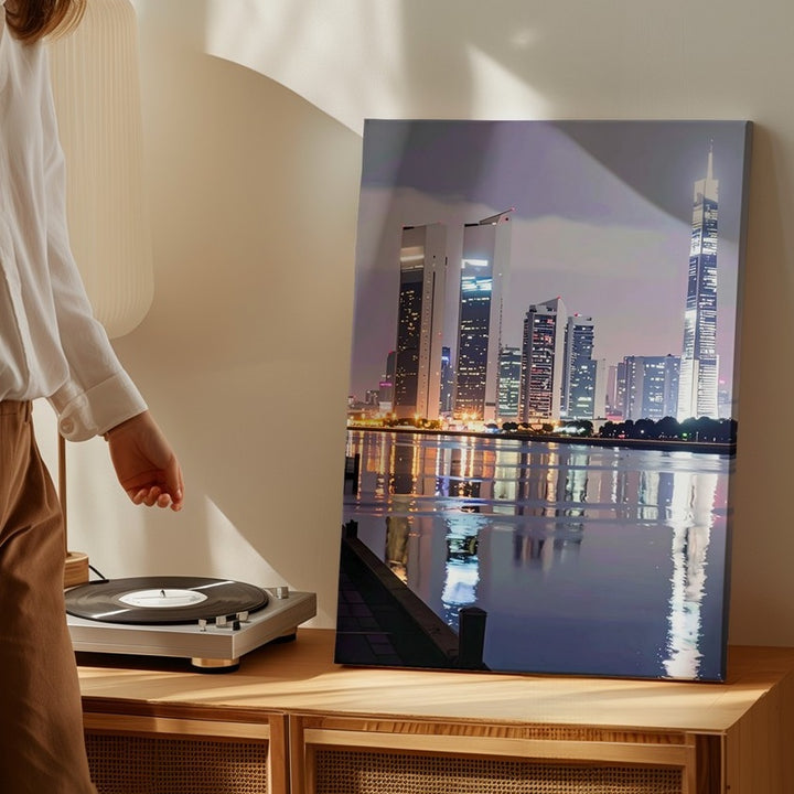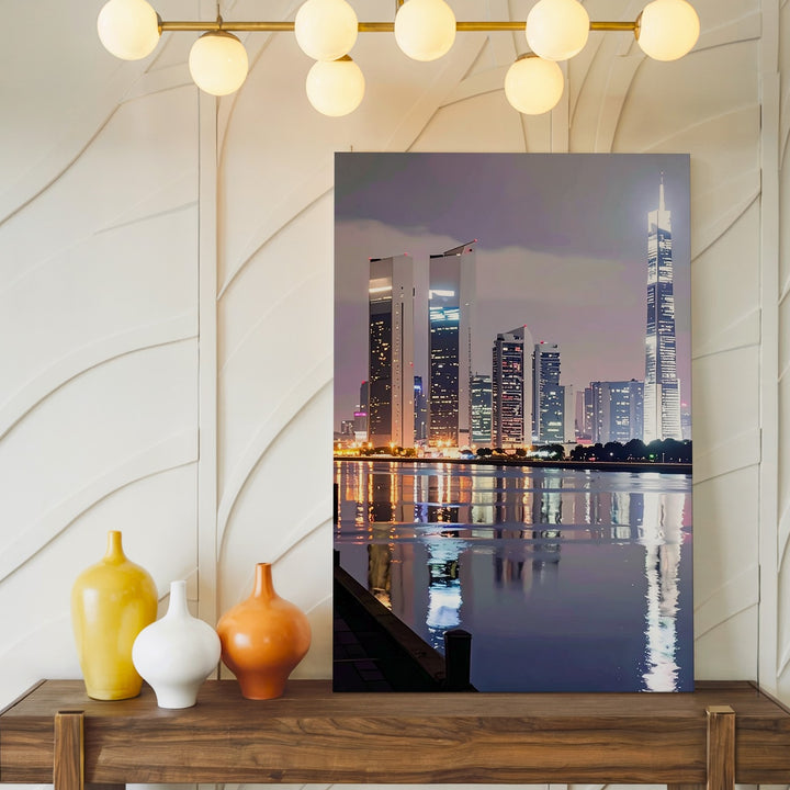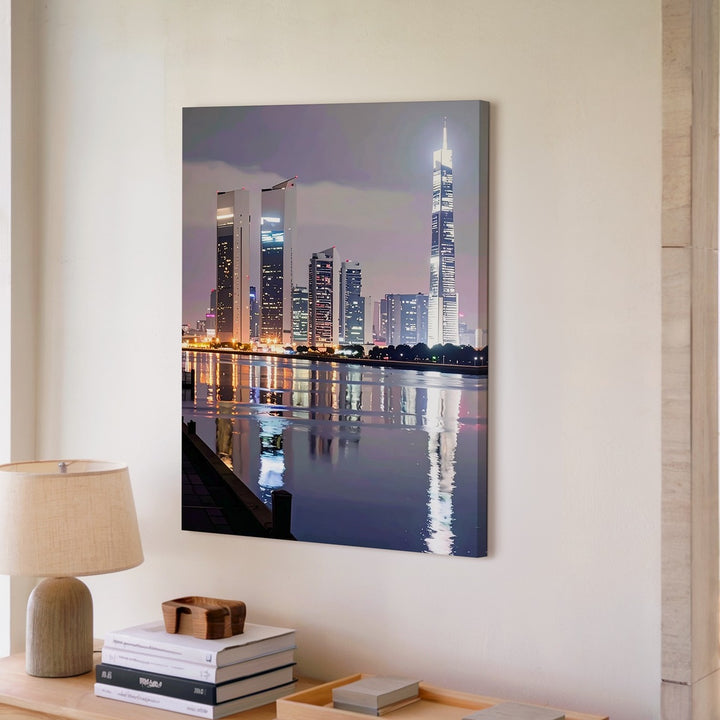 Minimalist Night Cityscape Canvas – Skyscrapers and Reflections on Calm Waterfront