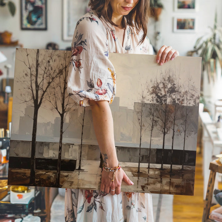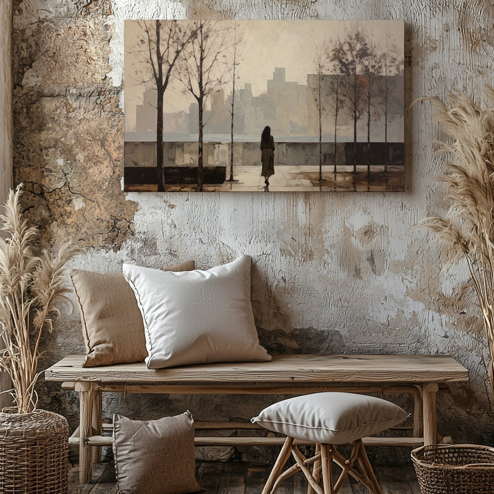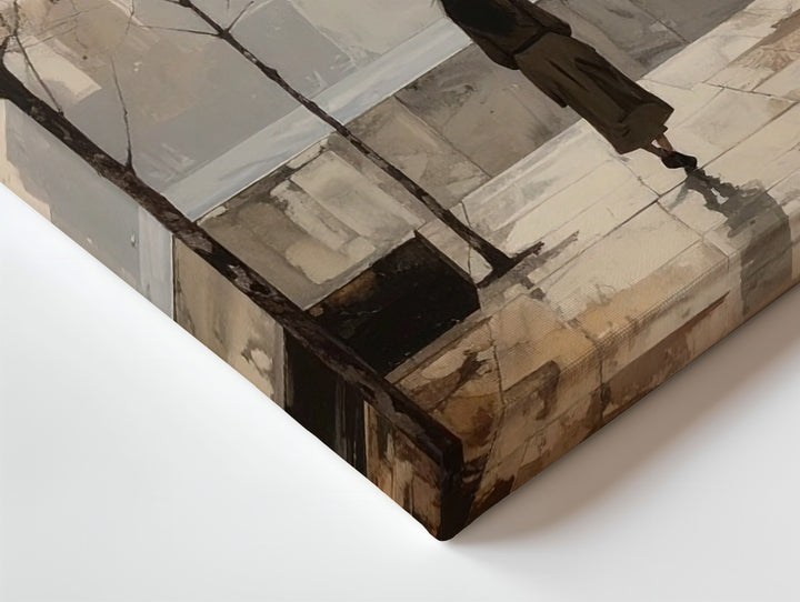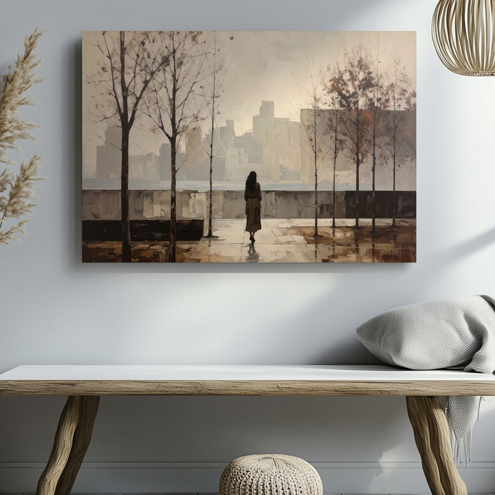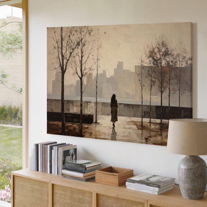 This minimalist canvas paints a solitary figure strolling down a rain-kissed city sidewalk, framed by bare trees and softened by foggy buildings fading into the distance. Rendered in muted sepia tones, the scene speaks of peaceful solitude, gentle reflection, and the calm after a storm. Its quiet simplicity invites your space to hold stillness and thoughtful pause amidst the rush of life.