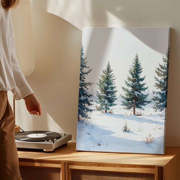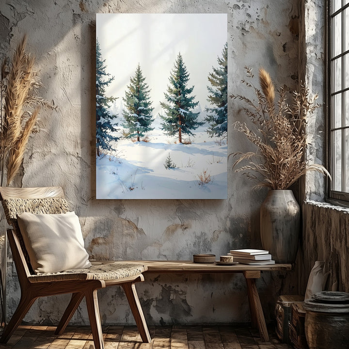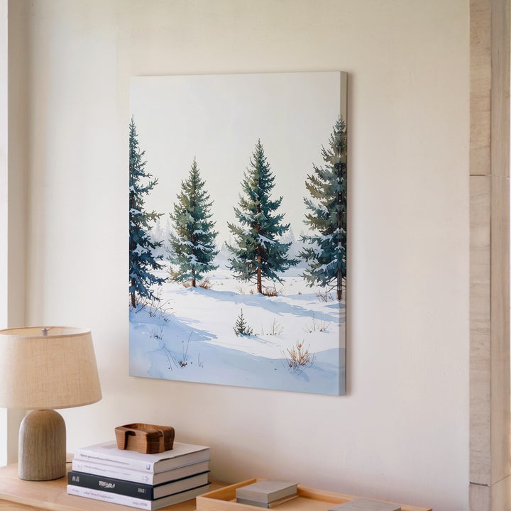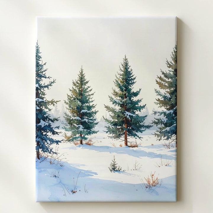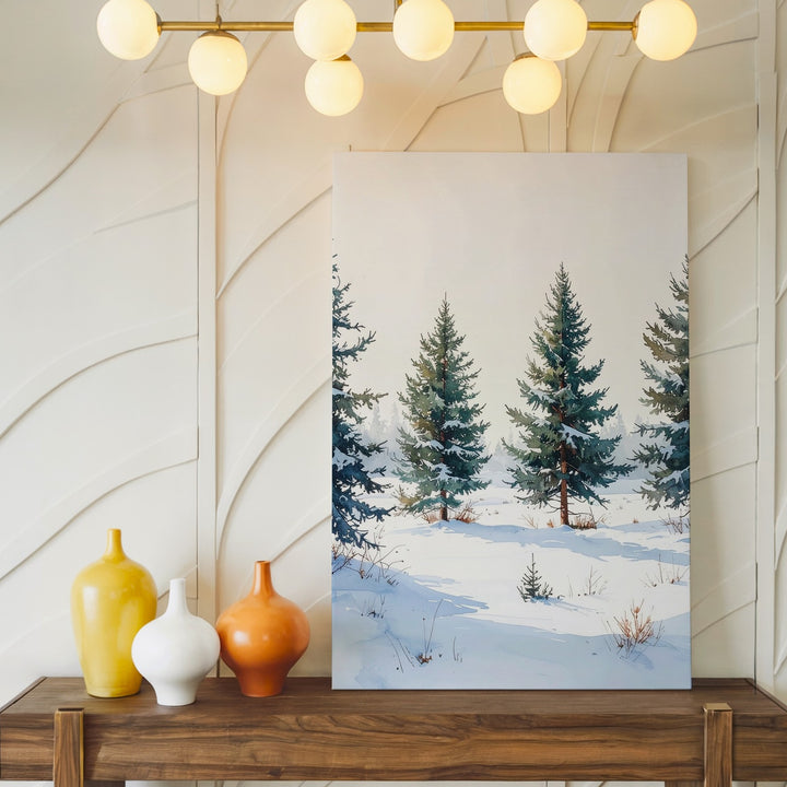 This minimalist canvas presents five snow-dusted pine trees standing quietly in an open snowy field. Against a clean white backdrop, the muted greens softened by fresh snow convey serene calm and subtle elegance. With gentle shadows grounding the scene, the composition invites contemplation of winter’s pure beauty and the peaceful solitude of untouched nature.