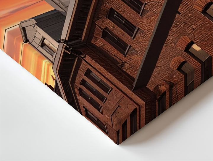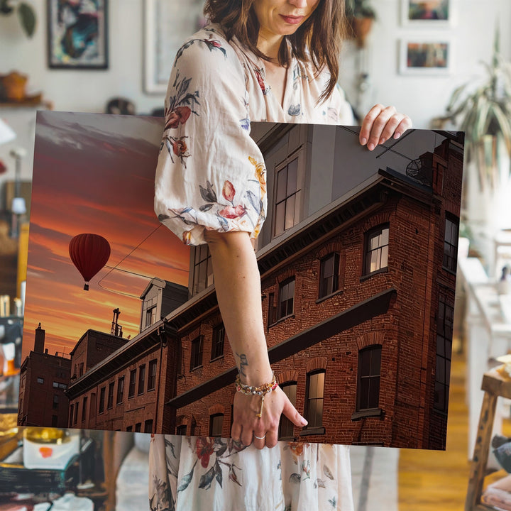 This minimalist canvas captures a contemplative sunset moment—a quiet brick building bathed in soft orange and pink light, its windows reflecting the end of day. Above, a single red hot air balloon drifts through the pastel sky, offering a surreal and gentle contrast to the structure's clean lines. Long shadows, warm tones, and uncluttered forms create a cinematic sense of peace and possibility.