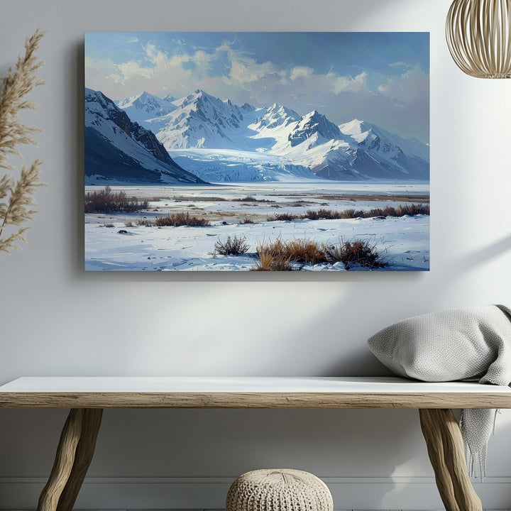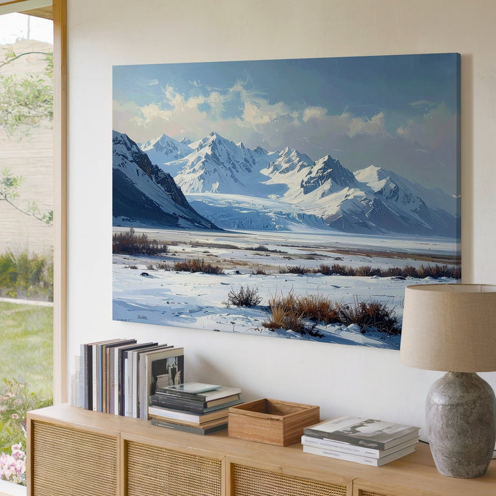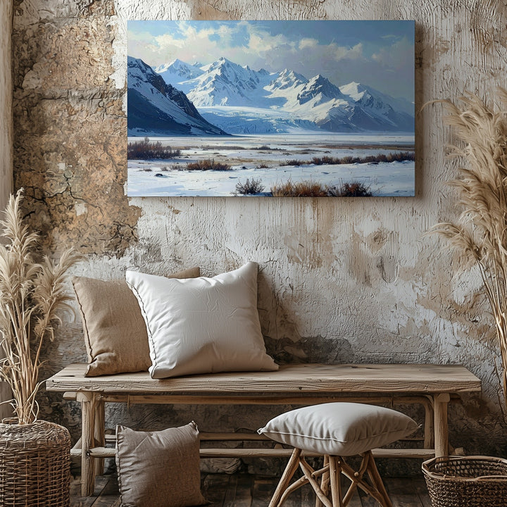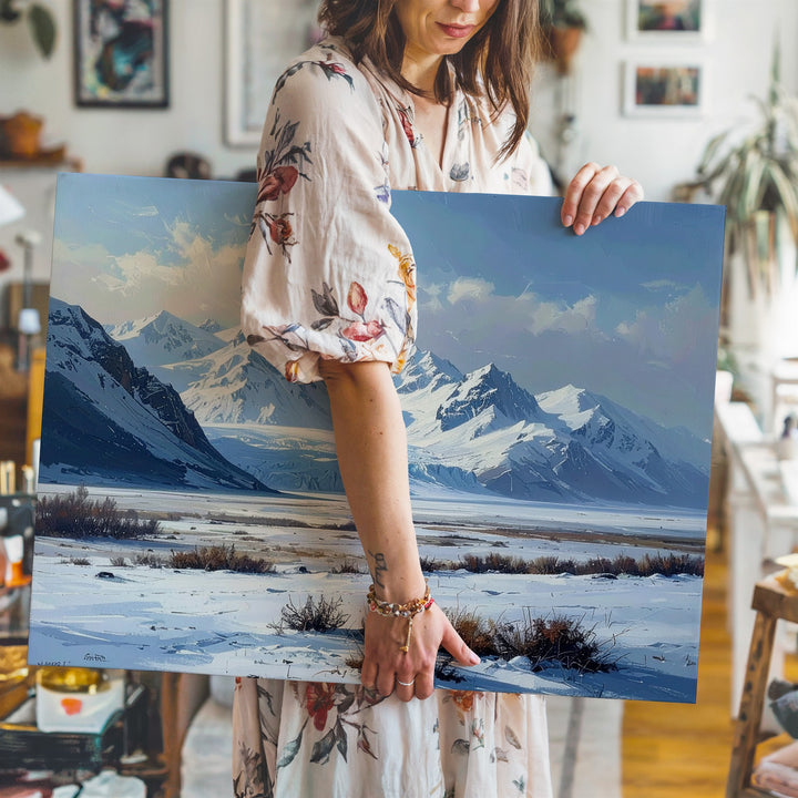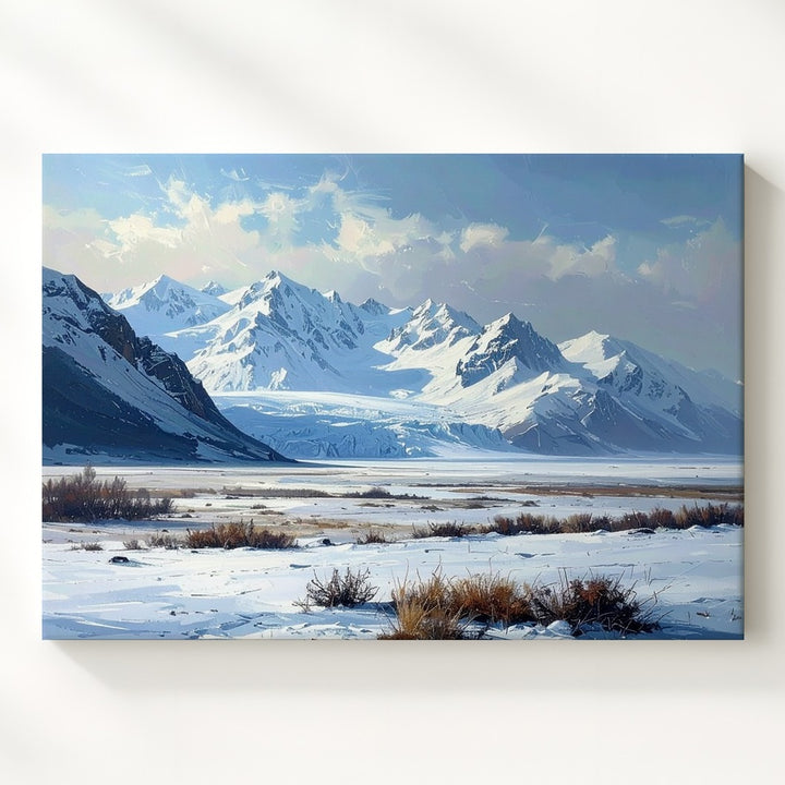 This minimalist winter canvas captures a sacred silence—an untouched snowfield stretching toward distant icy-blue mountains, under a pale, clouded sky. Sparse patches of dry grass and a quiet shrub line offer subtle texture against the vast openness. With soft whites, gentle grays, and faded blues, this artwork evokes solitude, contemplation, and the raw beauty of a world left undisturbed.