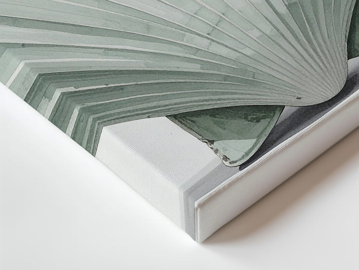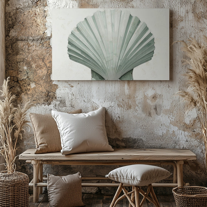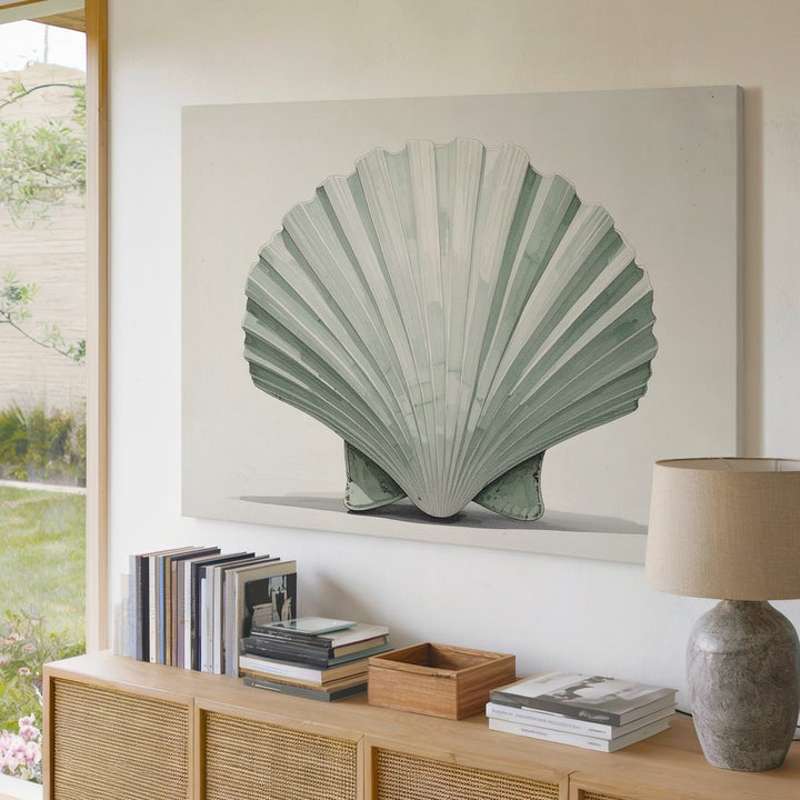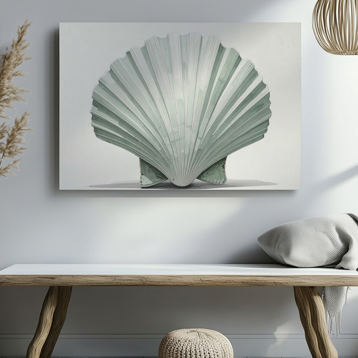 This minimalist canvas features a pale mint green scallop shell centered against a crisp white background. Soft gradients and subtle shading reveal the shell’s delicate ridges and perfect radial symmetry, evoking the timeless beauty of the ocean’s gifts. With its clean lines and serene palette, this artwork is a fresh, modern homage to coastal charm and natural form.