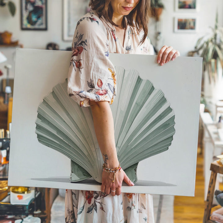 Mint Green Scallop Shell Canvas – Minimalist Coastal Illustration