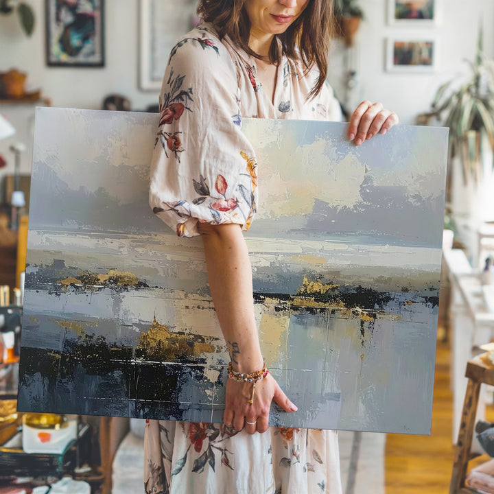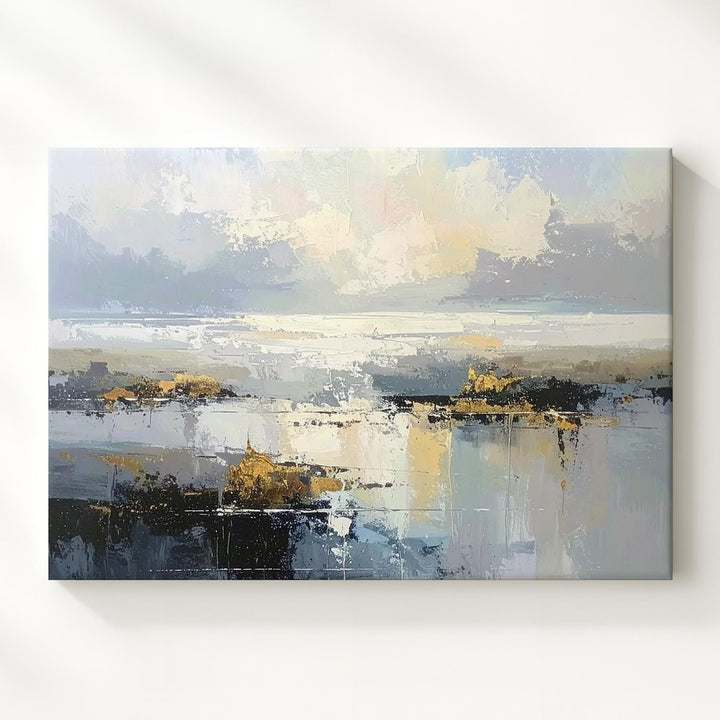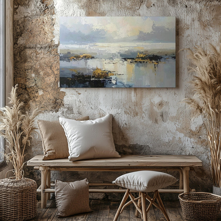 This tranquil abstract canvas captures the essence of a distant horizon veiled in mist. Blending pale grays, soft blues, and gentle hints of yellow, the painting flows with horizontal brushstrokes that evoke water reflections or drifting clouds. With no defined objects, it speaks through atmosphere alone—offering a quiet meditation on stillness, openness, and the calm that follows release.