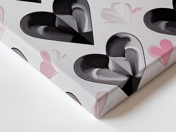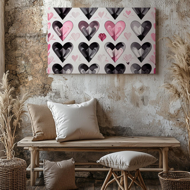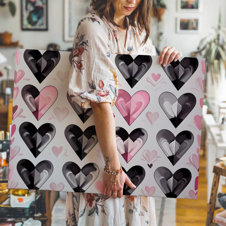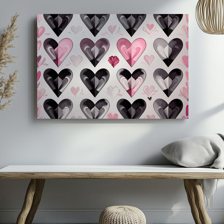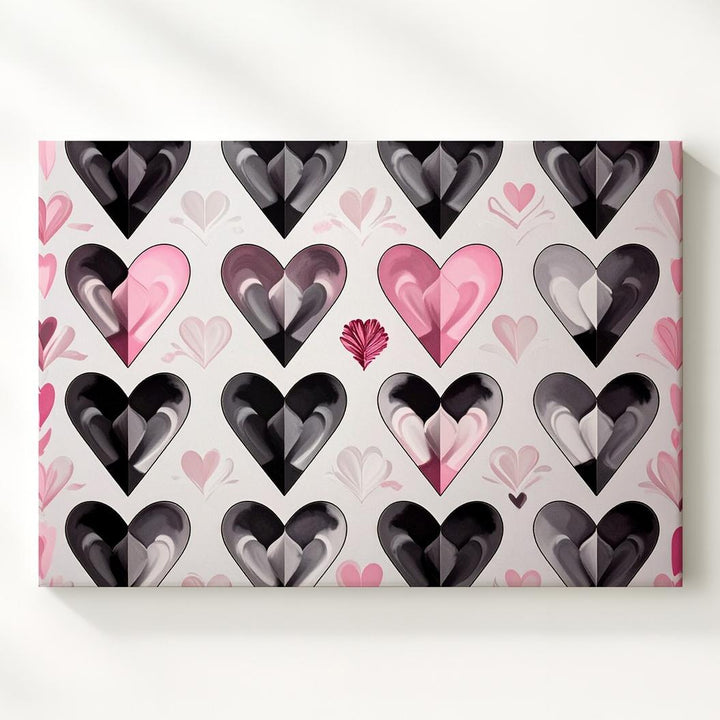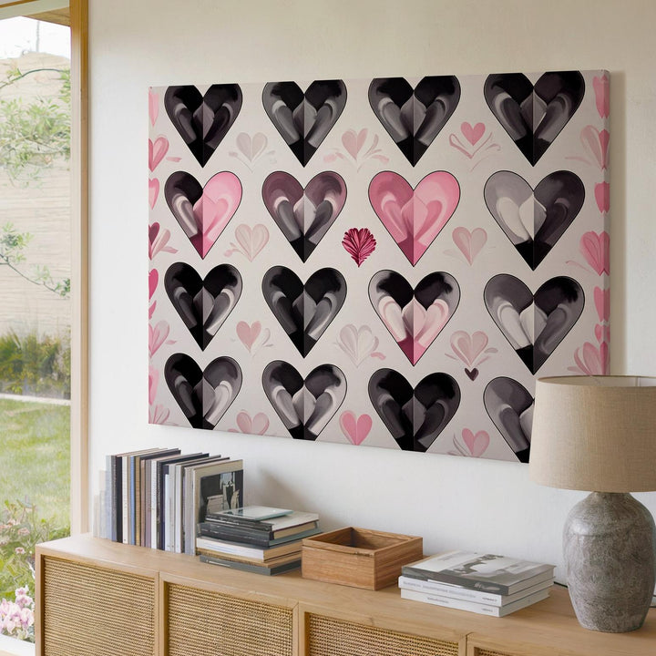 This striking canvas speaks volumes through simplicity: a perfect grid of bold black hearts, interrupted only by one soft pink heart at its center. Against a crisp white background, the design feels modern, orderly, and emotionally resonant. It’s a visual metaphor for individuality, tenderness, and quiet strength—the kind of art that doesn’t just fill a wall, but starts a conversation.