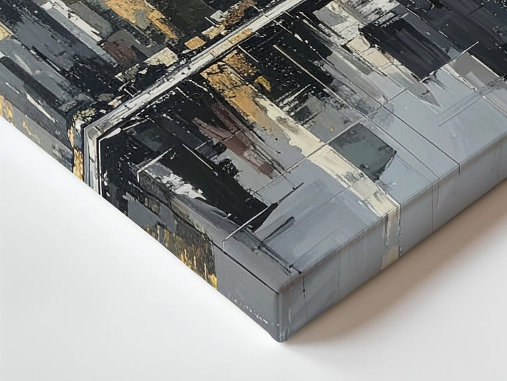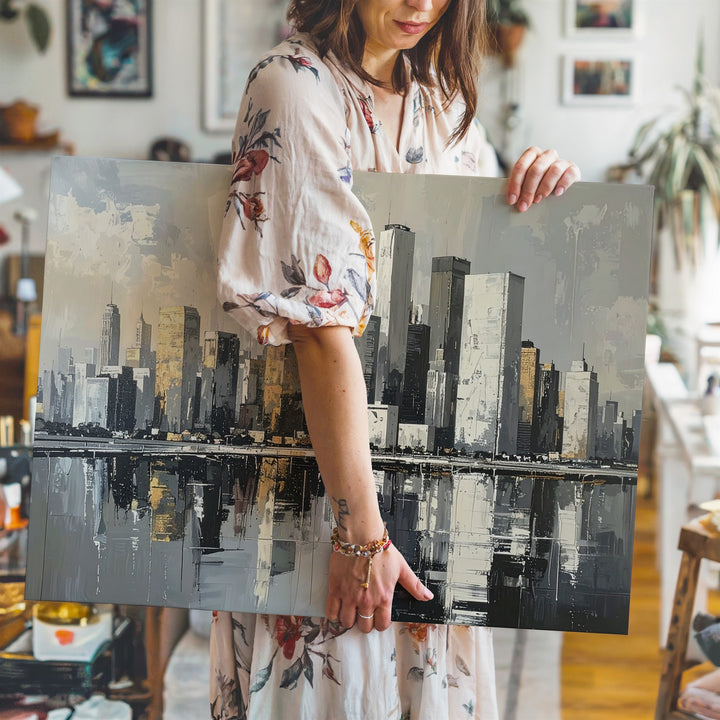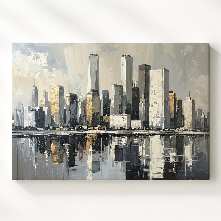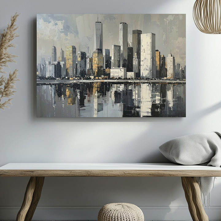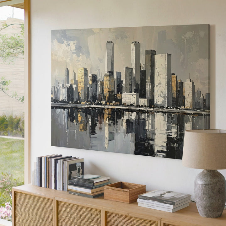 This refined canvas captures the essence of modern city living through minimalist grace. A serene skyline of tall, elegant skyscrapers stands mirrored in calm water, blending muted grays, beiges, and soft golden undertones. With perfectly balanced reflections and smooth brushstrokes, the artwork evokes a quiet moment at dawn or dusk—where vertical beauty rises from stillness. Subtle, sophisticated, and timeless.
