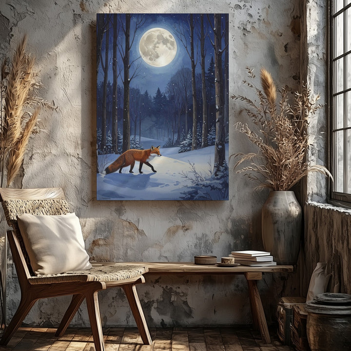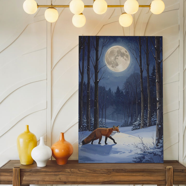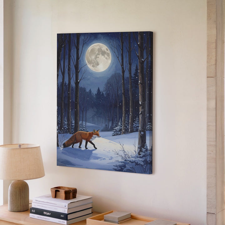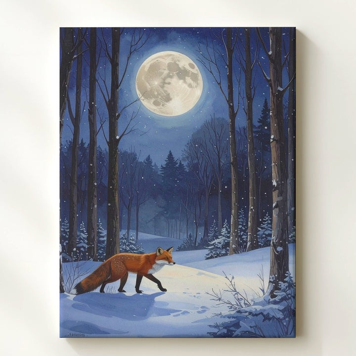This magical canvas captures a red fox moving cautiously through a snow-blanketed forest, bathed in soft moonlight. Tall, bare trees stretch upward, fading gently into mist, while falling snow adds quiet motion. The fox’s alert stance and shimmering fur reflect the ethereal blues and grays of the night, inviting you into a serene moment of wonder and mystery in the heart of a winter wilderness.