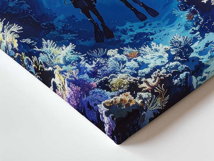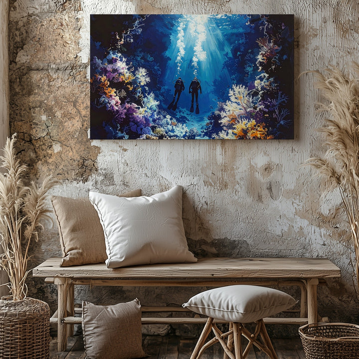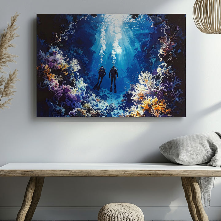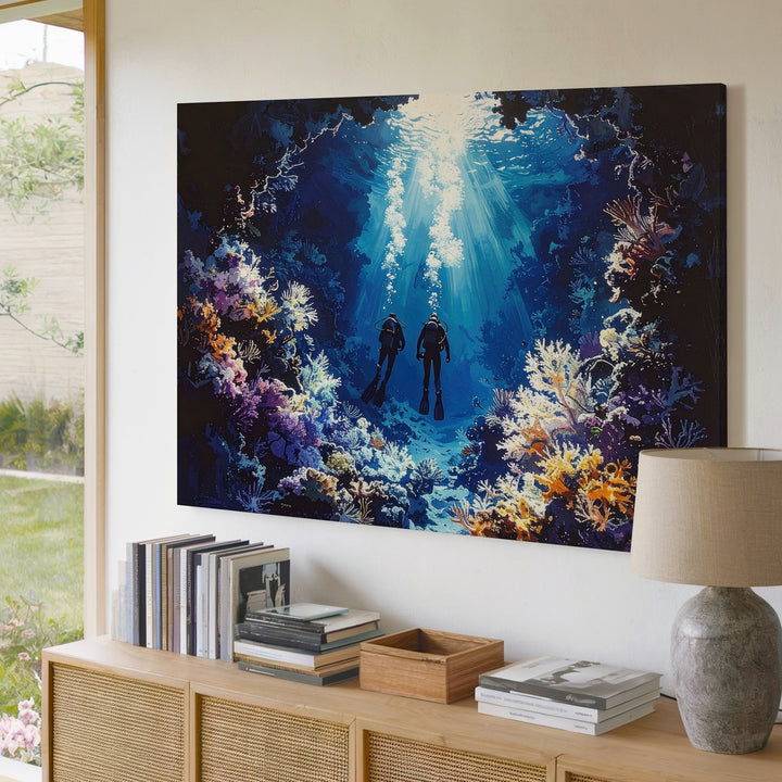 Mystical Deep Dive Canvas – Moody Underwater Scuba Divers Art