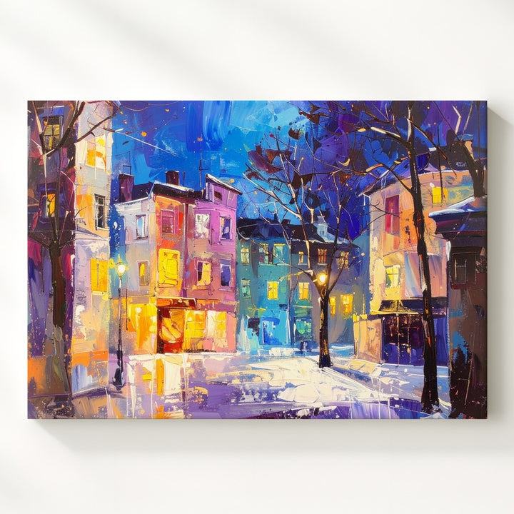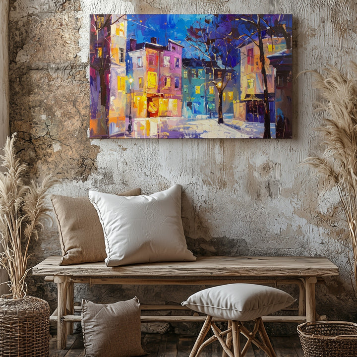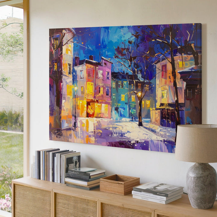 Bathed in electric blues, glowing purples, and bursts of yellow light, this abstract cityscape hums with life after dark. Stylized buildings rise against a deep sky, while leafless trees add an organic silhouette to the vibrant geometry. Reflections shimmer on icy ground, and thick, expressive textures give the piece a bold, kinetic energy. It’s a surreal, neon-soaked vision of a city that never stops moving—perfect for those who thrive in the buzz of the extraordinary.