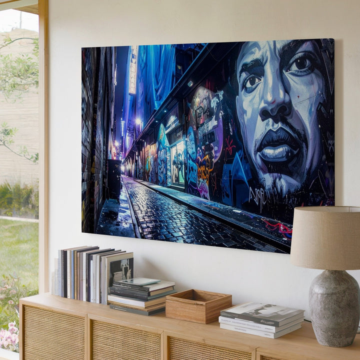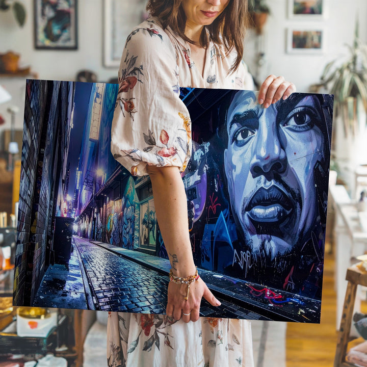 This vibrant canvas plunges you into a gritty urban alleyway glowing with neon blues and purples. Walls covered in detailed graffiti and a towering mural of a man’s face beside the bold word “ASAP” pulse with underground energy. Wet cobblestones reflect the colorful lights, drawing the eye deep into the heart of the artistic chaos. It’s a celebration of street culture, urban expression, and the beauty found in city backstreets after rain.