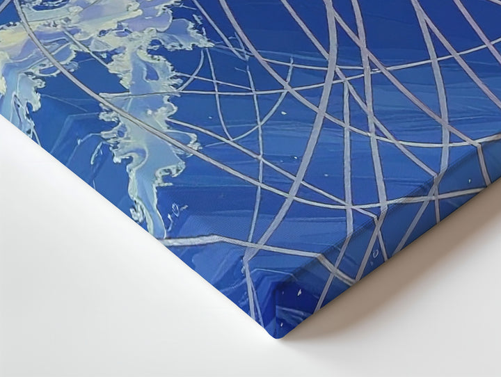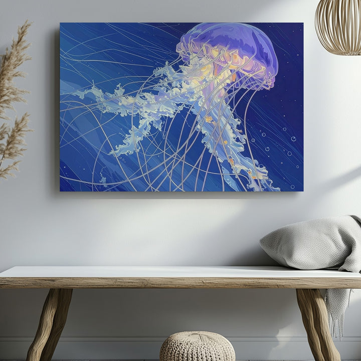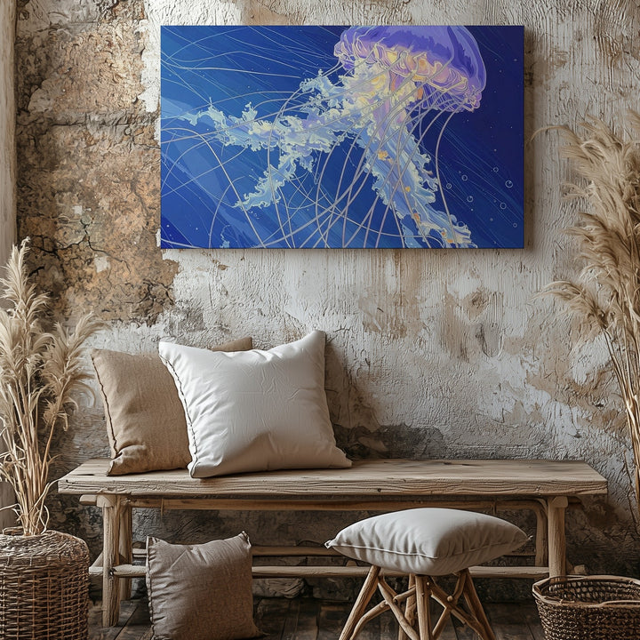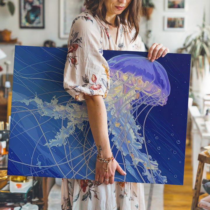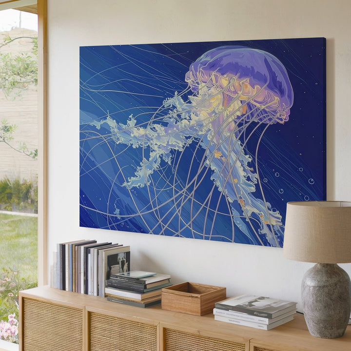Step into a world where the ocean meets the cosmos with this enchanting jellyfish canvas artwork. A single jellyfish floats weightlessly in deep blue waters, its pale lavender bell glowing with an inner light. Wispy, translucent tentacles fan outward, their movement captured in soft blues and whites, trailing fine light lines that mimic the flow of water. The background features subtle gradients and stars, blending oceanic beauty with the vastness of space. Ethereal and fluid, this piece invites contemplation and wonder, perfect for creating a dreamy atmosphere in any space.