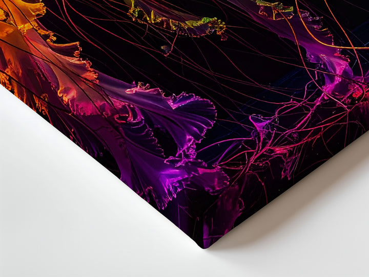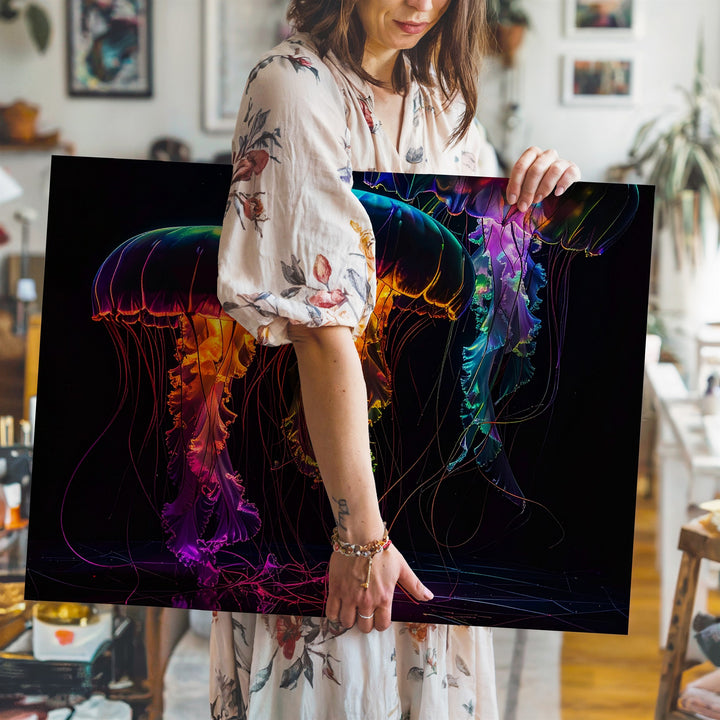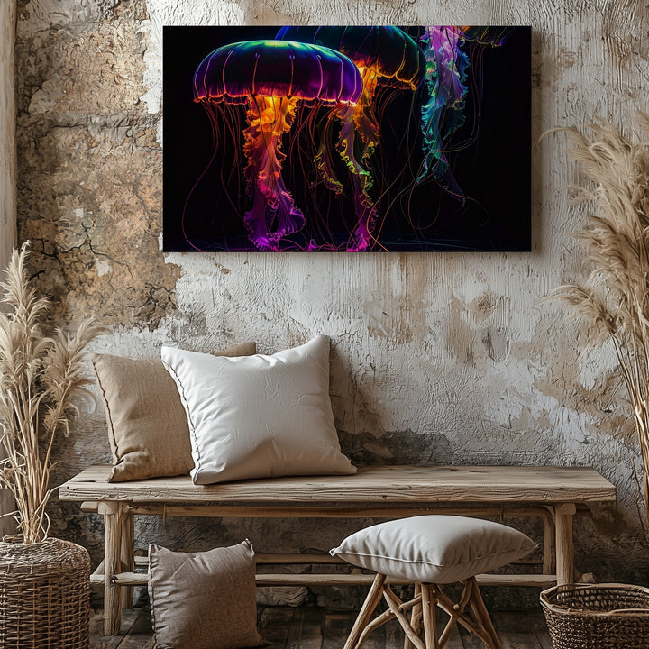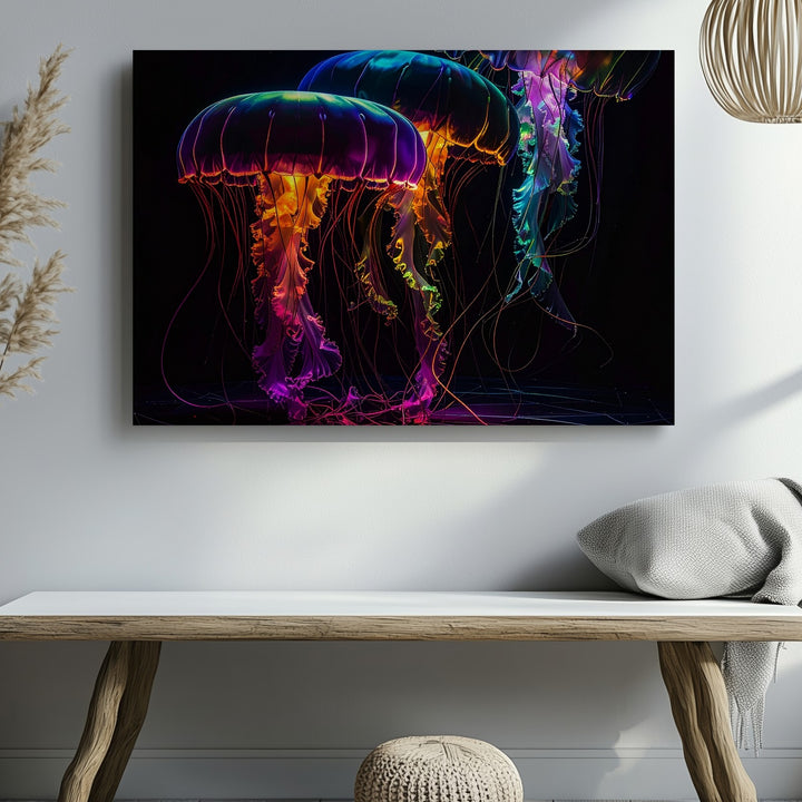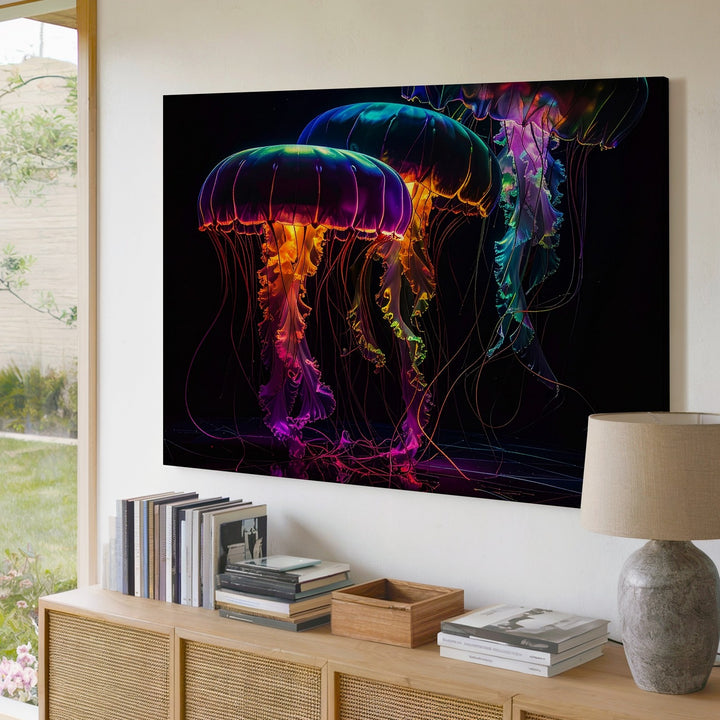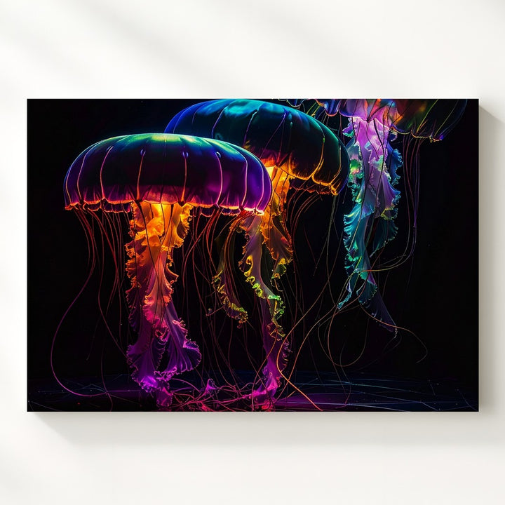 Neon Trio Canvas – Bioluminescent Jellyfish in Futuristic Glow